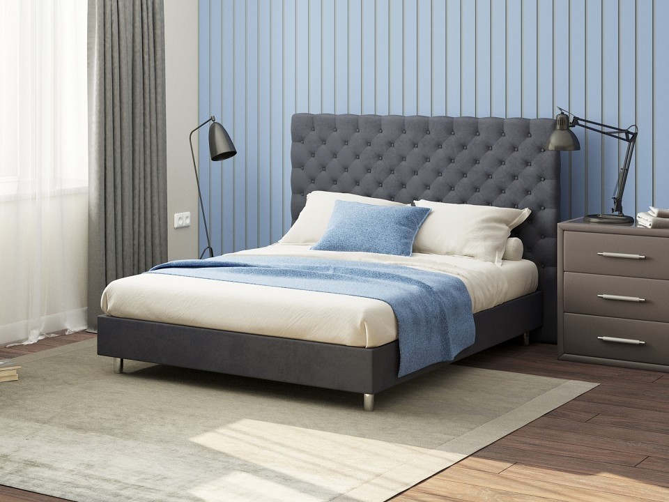 Длина спального места, мм: 2000, Ширина спального места, мм: 900, Цвет обивки: серый Ultra мокрый асфальт, Материал обивки: велюр, Материал корпуса: МДФ, фанера, Художественное описание товара: Высокое изголовье кровати Paris украшено стежкой-капитоне. Это придает особую элегантность и воплощение французской классики. Наибольшую популярность во всей Европе этот декоративный элемент обрел к середине XIX века. В комплекте Boxspring Standart - основание с березовыми ламелями. Каркас основания выполнен из высококачественных материалов: МДФ и фанеры, усиленной внутри ребрами жесткости. Односпальный размер основания (800/900/1000 мм) имеет систему крепления между собой., Дополнительные параметры: Высота спального места от пола - 300 мм, толщина изголовья - 80 мм, высота опор - 100 мм, высота бокса - 200 мм.