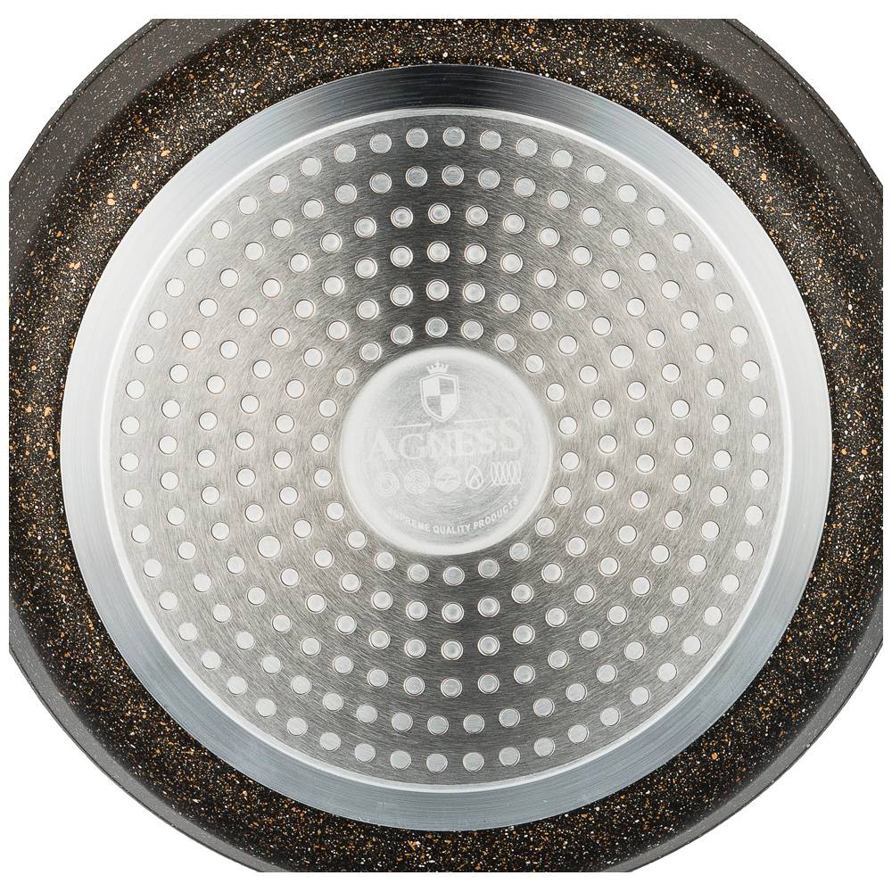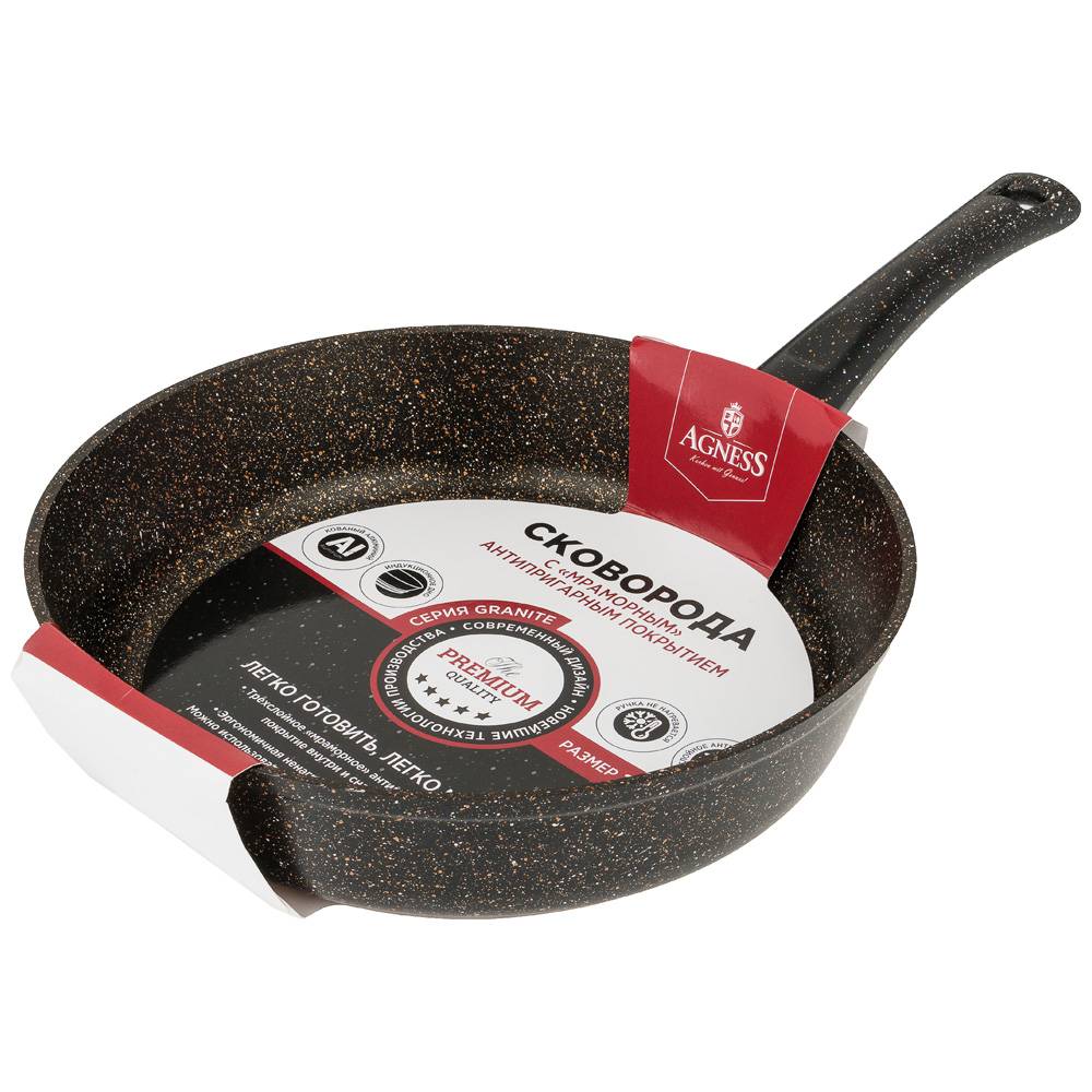 Марка AGNESS представляет посуду турецкого производителя серии Granite. Корпус сковороды выполнен из кованного алюминия. Благодаря этой технологии корпус становится более прочным, износостойким и не подвержен деформации.
