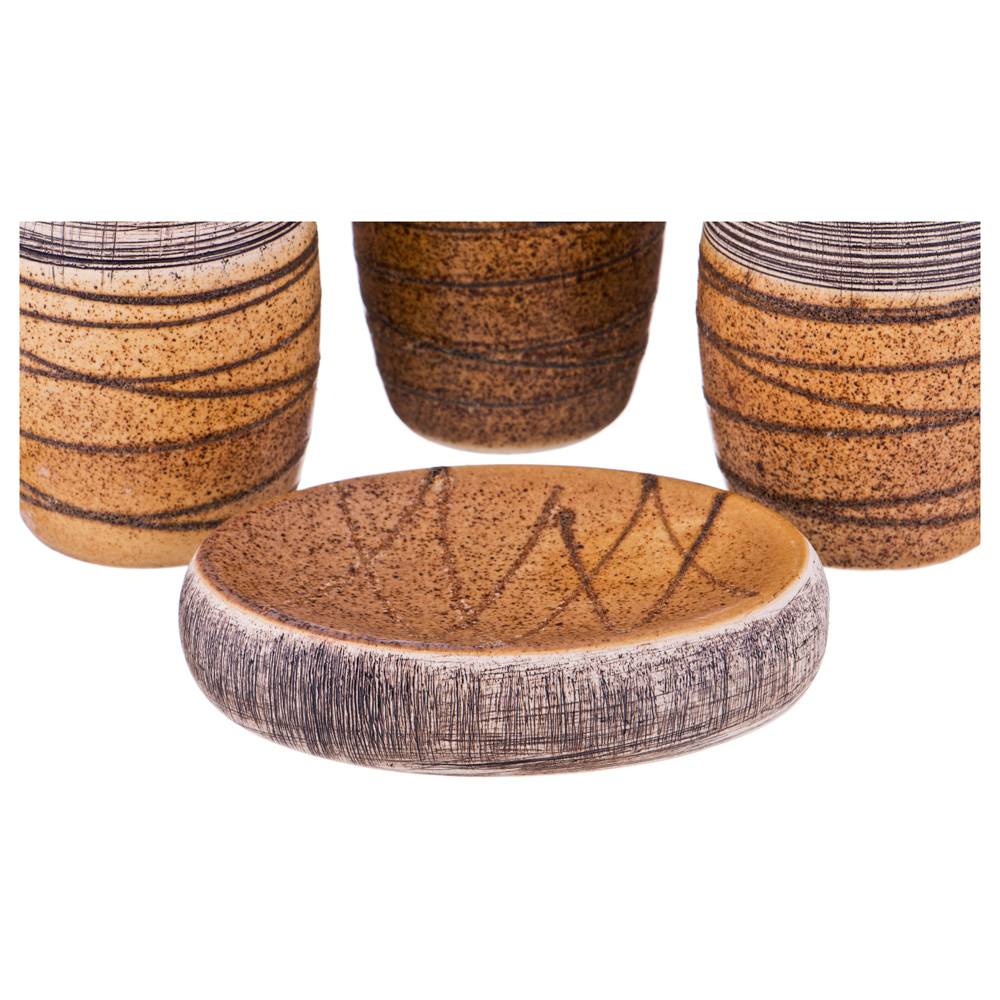 Набор аксессуаров для ванной комнаты состоит из дозатора для жидкого мыла, подставки-стакана, подставки для зубных щёток и мыльницы для кускового мыла.