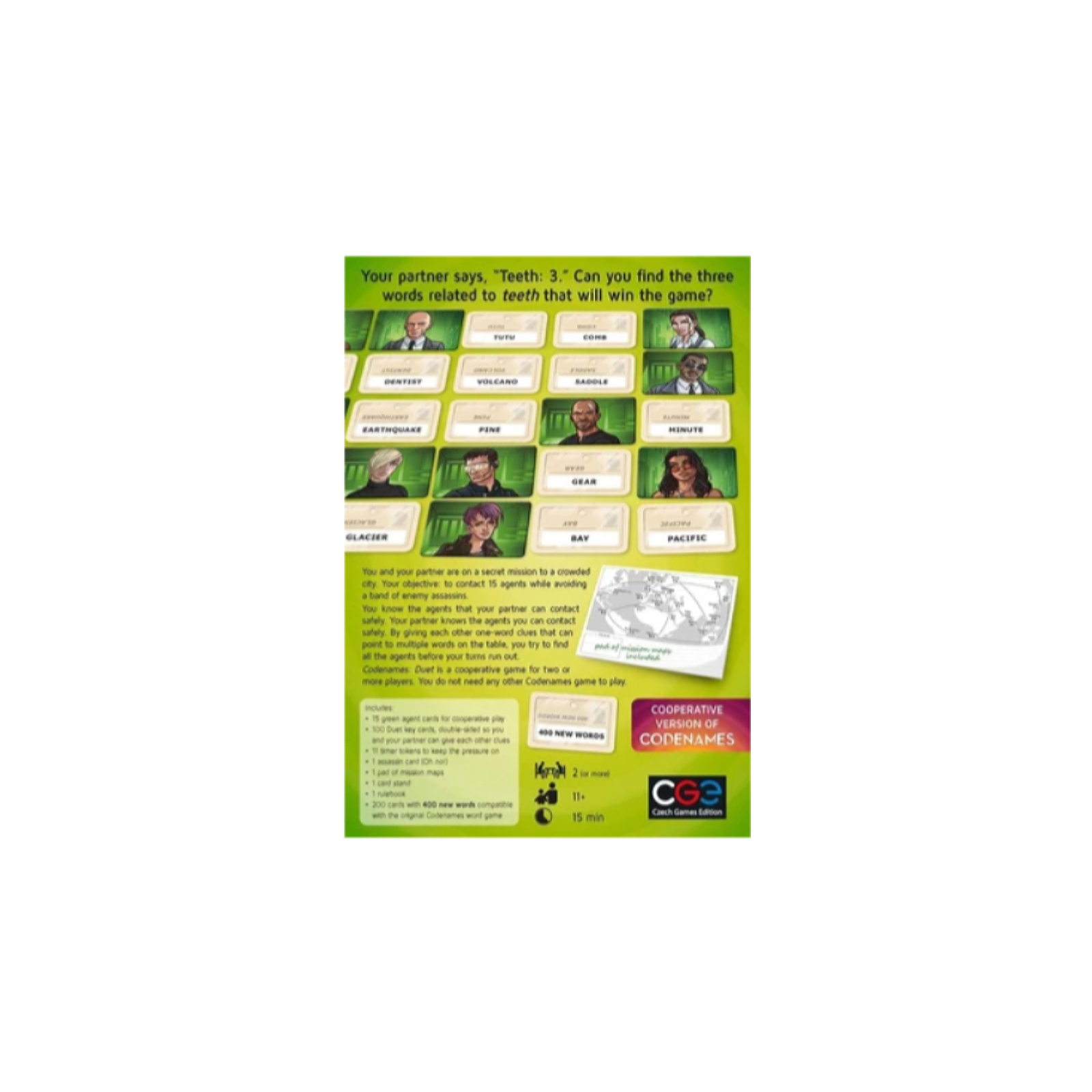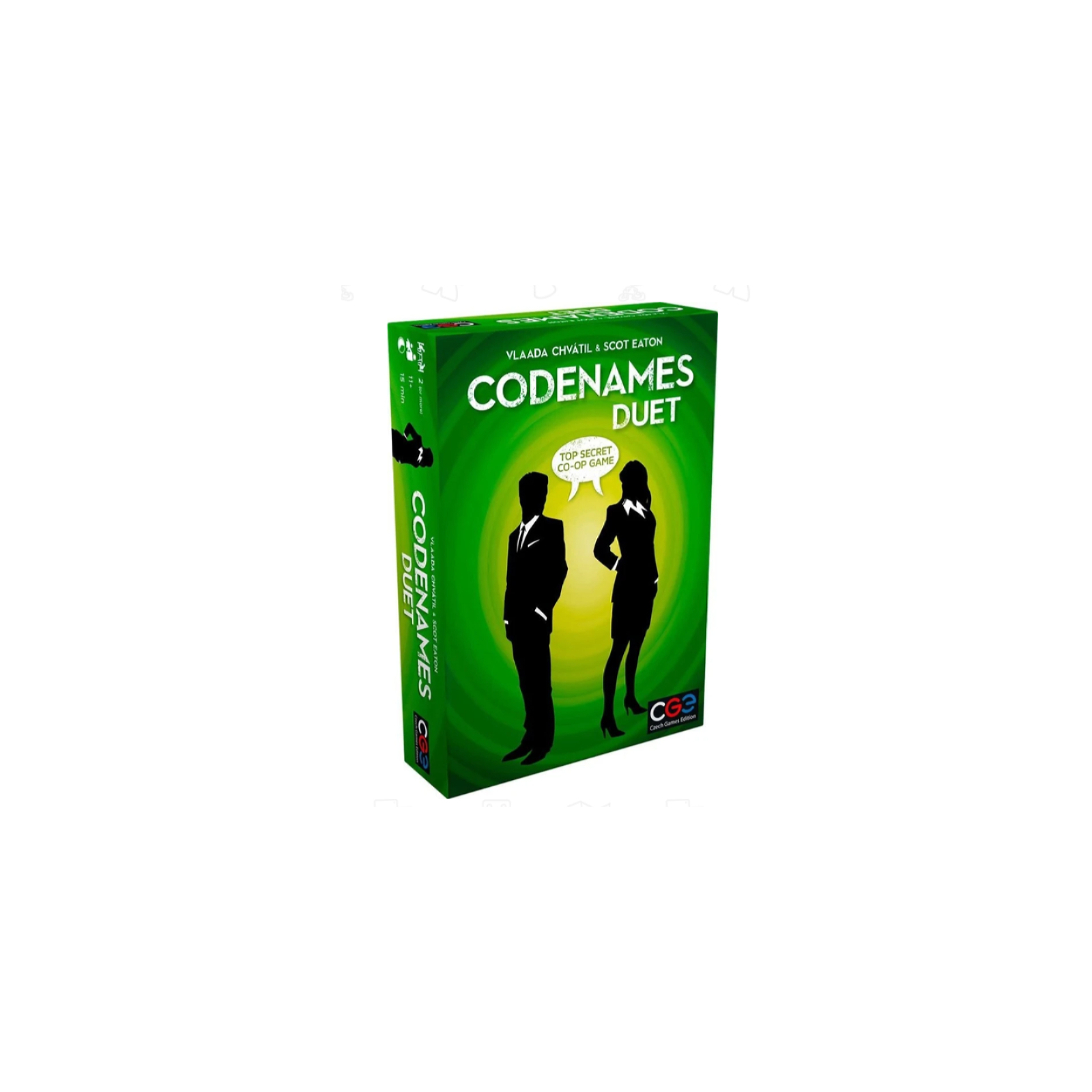 Кооперативна версія знаменитих «Кодових імен», призначена для двох гравців. У гру можна грати й великою кількістю гравців, якщо розділитися на дві команди. Базова механіка «Кодових імен» не зазнала принципових змін у версії «Дует»: гравці отримують підказку – слово+цифру – і за асоціаціями, які викликає у них задане слово, намагаються знайти на полі відповідні картки. Якщо гравці знайдуть усіх своїх агентів у відведений строк, що відміряється жетонами часу, і при цьому не наткнуться на вбивцю, вони перемагають у грі.