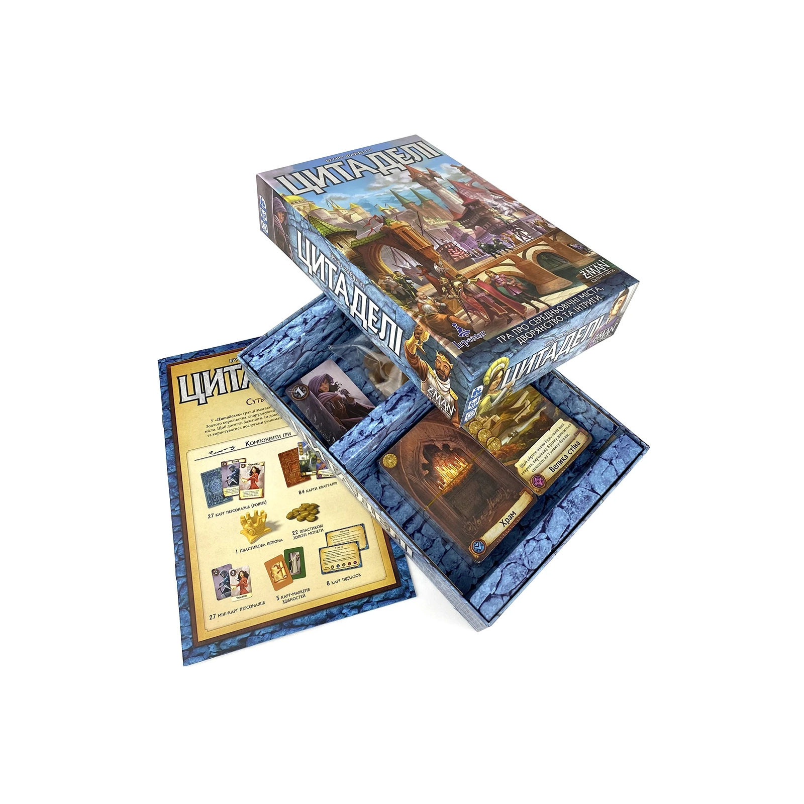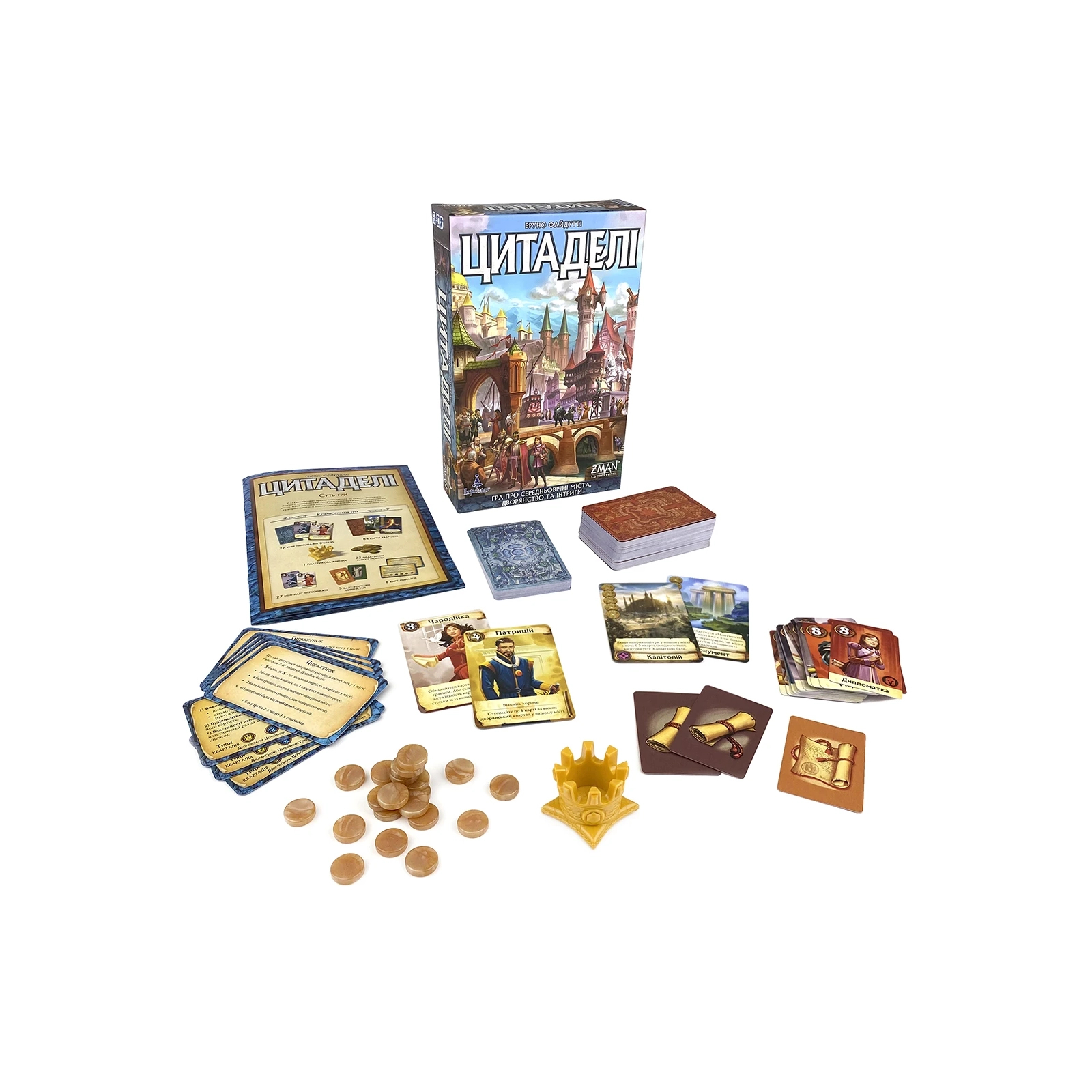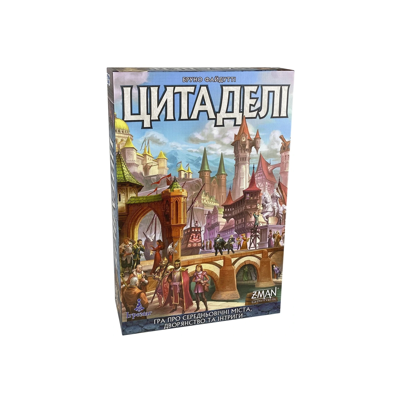 Цитаделі (Citadels): багато що вирішує знать та інтриги! Напевно, кожен хотів би закрутитися у вихорі придворних інтриг у боротьбі за владу, де на кожному кроці змови, а у повітрі витає аромат золота. Це ви можете зробити в картковій психологічній настільній грі Цитаделі, від якої віє подихом фентезійного Середньовіччя та яка пропонує гравцям неабияку частку блефу. Настільна гра Цитаделі (Citadels) розроблена відомим італійським автором Бруно Файдутті сьогодні входить до ТОП 200 настільних ігор у рейтингу сайту BoardGameGeek. У яскравому та значному перевиданні крім базових компонентів, гравців чекає дванадцять нових персонажів та нові особливі квартали. В умовах жорсткої конкуренції вам доведеться будувати квартали середньовіччя, заручившись допомогою впливових персон того часу і плести закулісні інтриги. Чи зможете ви побудувати найприбутковіше місто, всупереч підступним конкурентам? Не женися за розміром, побудуй найкрасивіше і найбагатше місто! В ігровий набір входить 27 карт персонажів, 27 жетонів персонажів, 84 карти кварталів, 6 карт підказок, 30 золотих монет та корона. Перед початком гри розкладіть жетони персонажів від першого рангу до восьмого. Кожен гравець отримує по дві золоті монети і чотири карти кварталів. У центрі столу покладіть колоду із кварталами, біля неї покладіть запас золотих монет. Ви можете самостійно скласти свій набір ролей, але краще скористатися готовими комбінаціями, які збалансовані і мають опис приблизного характеру гри. Власник корони, а її на початку отримує найстарший гравець, ретельно перемішує колоду з персонажами та скидає вказану в інструкції кількість карток у закриту та відкриту. Після цього пускаючи колоду по колу, кожен вибирає собі персонажа на поточний раунд. Далі король по черзі викликає персонажів кожного рангу. Як тільки викликається король, корона переходить до гравця, який вибрав цього персонажа. Коли головний гравець викликає персонажа, він має виконати дію на вибір, або взяти дві монети зі скарбниці, або дві карти кварталів, одну карту залишає собі, а іншу відправляє під низ колоди. У свій хід дозволено будувати лише один квартал. Квартали існують п'яти типів: дворянський, церковний, військовий, торговельний та особливий. Кожен із цих кварталів може принести гравцеві додаткові золоті монети. Кожен персонаж має свою унікальну властивість, яку гравець може використовувати лише один раз у свій хід у певний момент. Як тільки останній гравець завершує свій хід, карти персонажів віддаються коронованому та ігровий процес повторюється заново. Головна мета – завершити будівництво міста, тобто побудувати певну кількість кварталів залежно від кількості учасників. Гравець з найбільшою кількістю очок перемагає. Цитаделі: баланс у кожній деталі! Цитаделі (Citadels) - це досить цікава і проста гра для тих, хто хоче поринути у світ настільних ігор. Вона відмінно підійде як гравцям-початківцям, так і затятим настільникам. Ця настілка добре збалансована і має безліч комбінацій, з якими не нудьгуватимуть навіть найзавзятіші стратеги. Цитаделі радують новим дизайном, красивими ілюстраціями і просто шаленою реграбельністю. Нові карти кварталів збільшують кількість різноманітних комбінацій і дозволяють вибудовувати нові ходи та стратегії. Всім шанувальникам блефувати варто також звернути увагу на нас