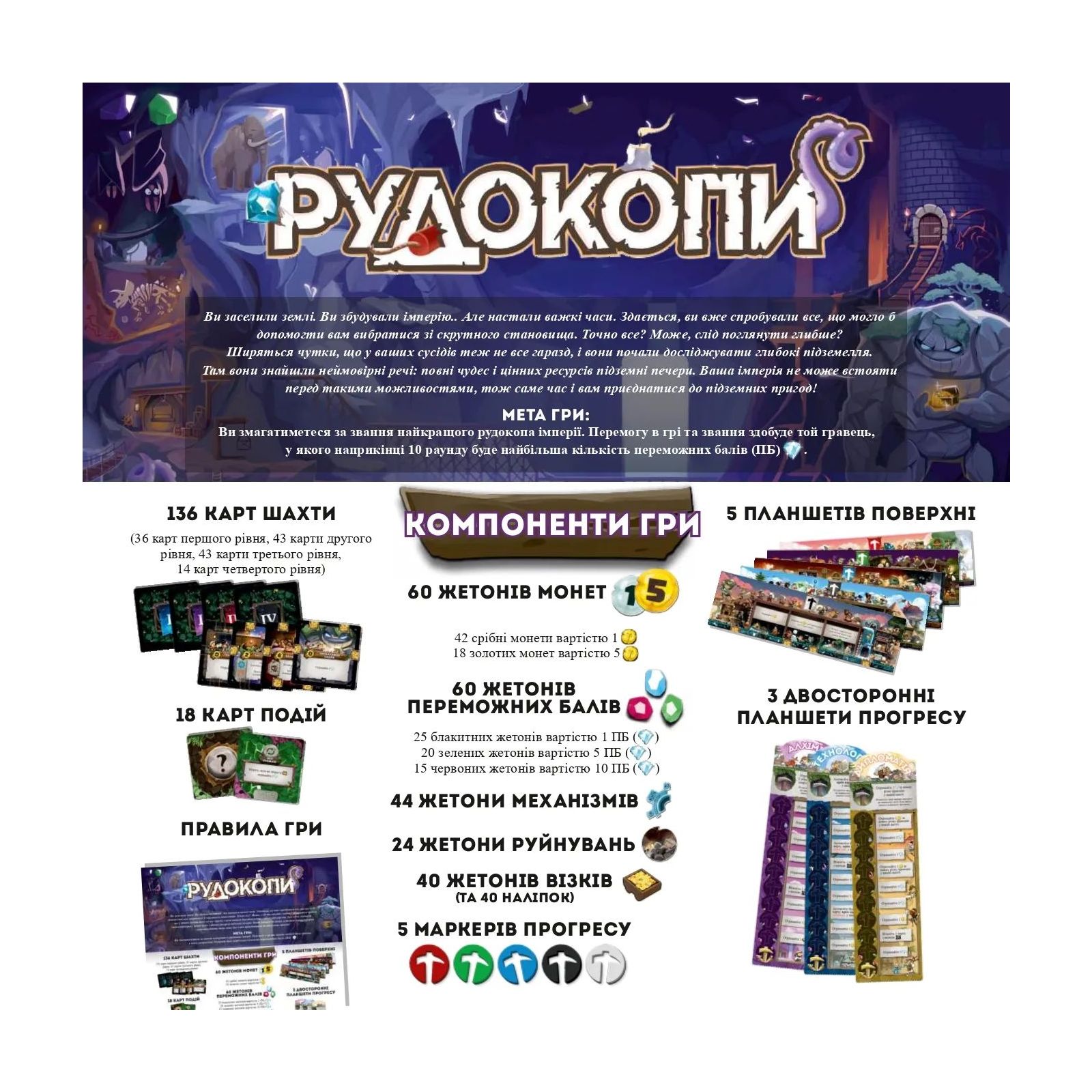 Настільна гра Rozum Рудокопи — це яскрава та цікава настільна гра, у якій ви зможете створити свою унікальну шахту, використовуючи різноманітні карти та стратегії. Вам вдалося збудувати прекрасну імперію на землі, заселивши багато земель. Але настали часи скрути, і, щоб вибратися з неї, ви пішли по допомогу до своїх підземних друзів. Вони розповіли вам про глибокі печери, наповнені скарбами та купою ресурсів. Вам одразу закортіло побувати там і спробувати допомогти імперії... Рухайтеся за шкалою прогресу, отримуйте бонуси та створюйте неймовірні комбінації. Завдяки швидкому ігровому процесу, гарним ілюстрація та простим правилам, Рудокопи ідеально підходять для гри як у колі друзів, так і з родиною.