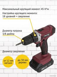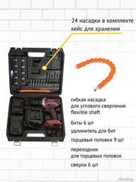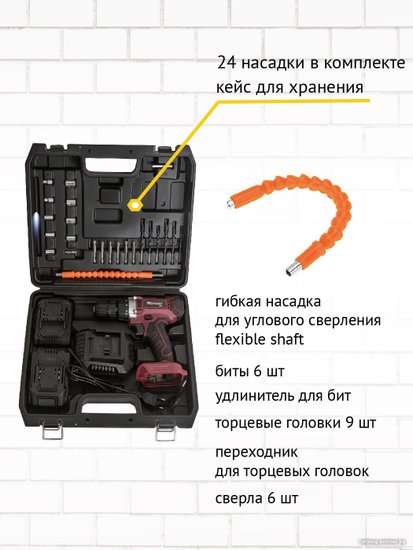 Комплектациядрель, биты 6 шт., сверла 6 шт., торцевые головки 9 шт., переходник для торцевых головок, удлинитель для бит, гибкая насадка для углового сверления (flexible shaft), аккумуляторная батарея, зарядное устройство, чемодан для хранения и переноски, руководство по эксплуатации, гарантийный талон
