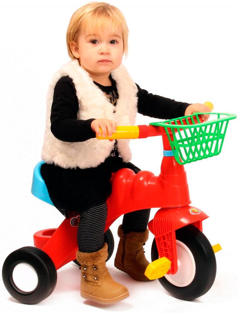 Трехколесный велосипед для детей от 2 лет. Рама из ударопрочного пластика. Устойчивые пластиковые колеса. Комфортное расстояние от сиденья до педалей. Удобный руль. Корзинка на руле.