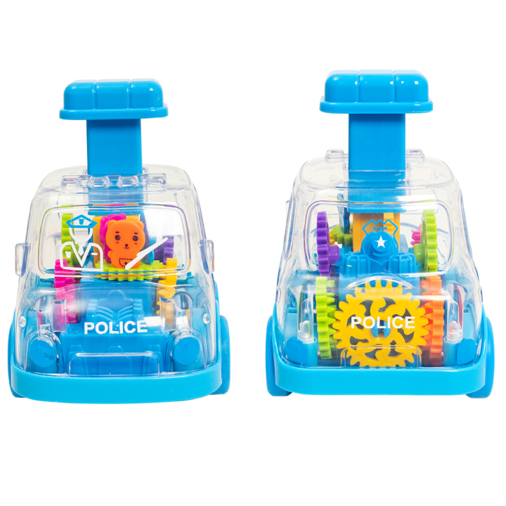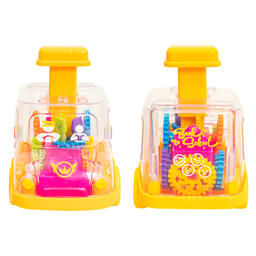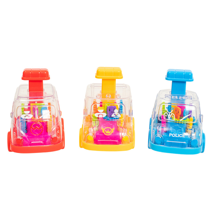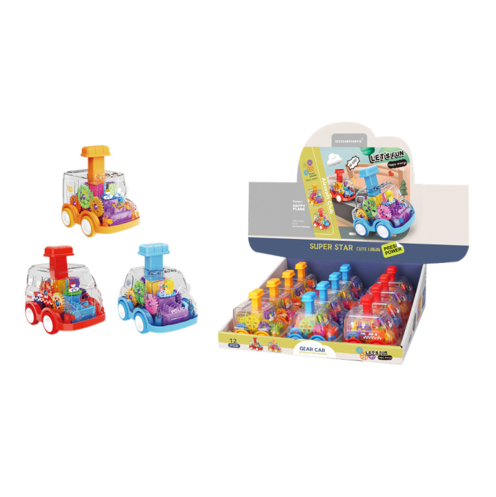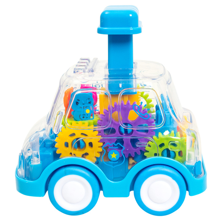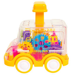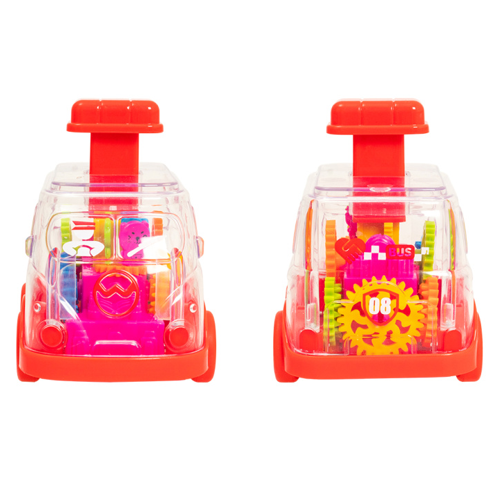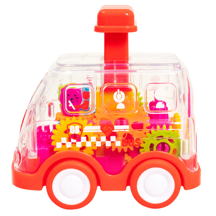 Прозрачная машинка с шестеренками внутри. Игрушка оснащена инерционным механизмом, который запускается нажатием кнопки на крыше машинки. Сквозь прозрачный корпус видно, как при нажатии кнопки шестерки внутри начинают вращаться. В ассортименте 3 цвета: голубая полицейская машинка, красный автобус, оранжевый школьный автобус.