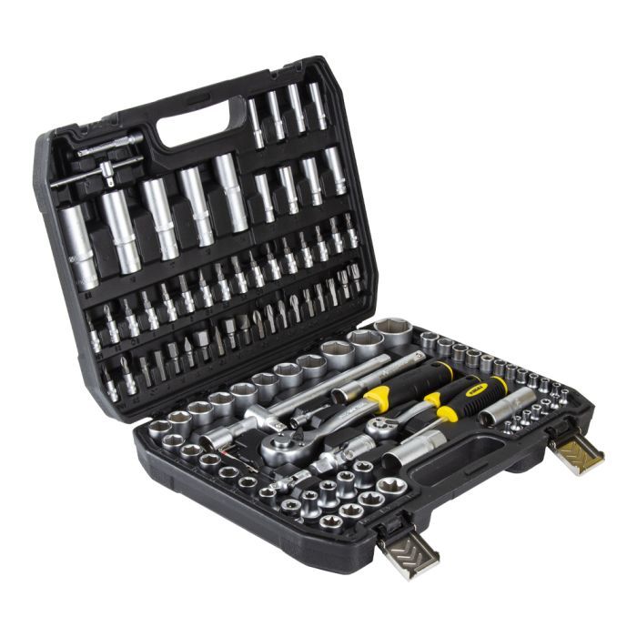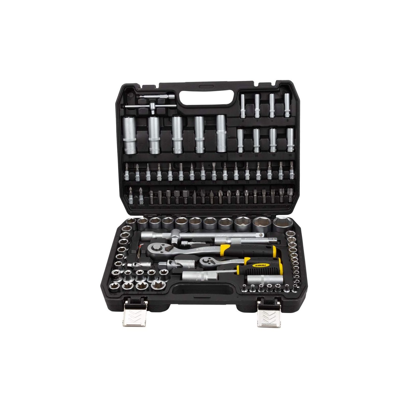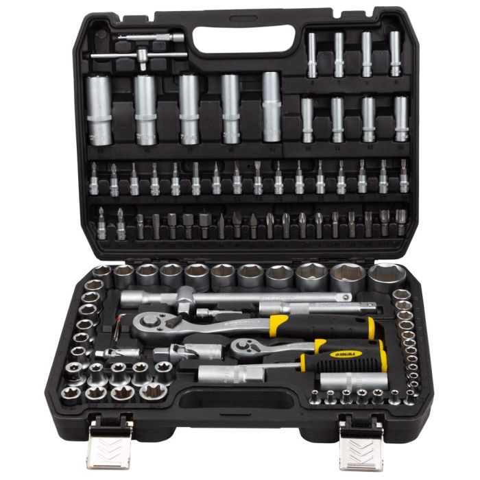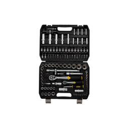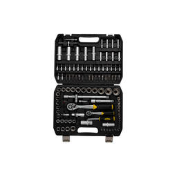 • Комплектація набору торцеві головки , інструменти для роботи з торцевими головками , біти , шестигранні/зіркоподібні ключі , тримач для біт , тріскачка , подовжувач , вороток , кардан шарнірний , рукавички