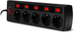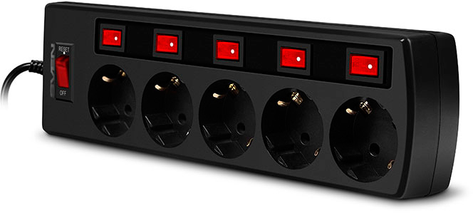 Сетевой фильтр, 3 м, Количество розеток: 5, евро с заземлением, 2200 Вт, раздельный выключатель, общий.