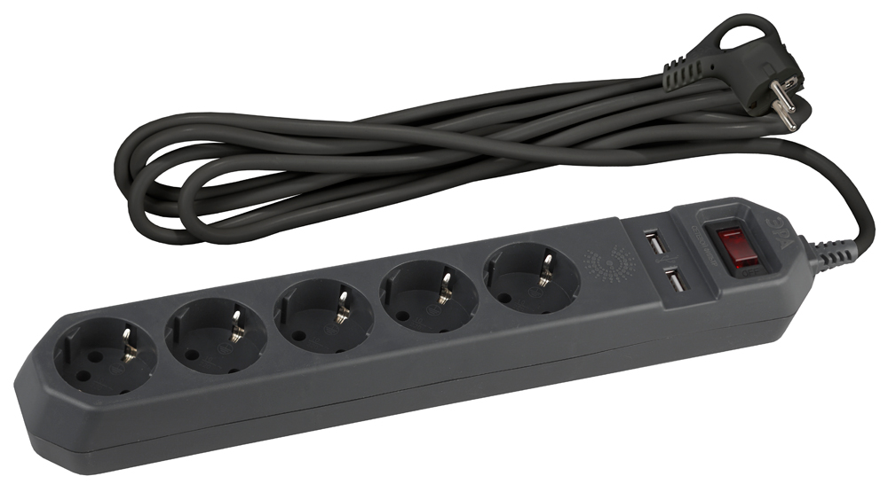 Сетевой фильтр, 1.5 м, Количество розеток: 5, евро с заземлением, 2200 Вт, общий выключатель, USB-порт: 2.