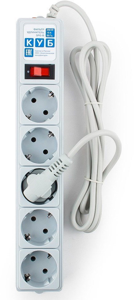 Сетевой фильтр, 3 м, Количество розеток: 5, евро с заземлением, 2200 Вт, общий выключатель.