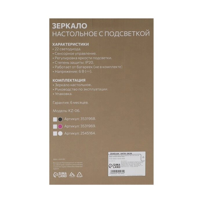 Зеркало LuazON KZ-06, подсветка, 26.5 х 16 х 12 см, 22 диода, сенсорная кнопка, белое