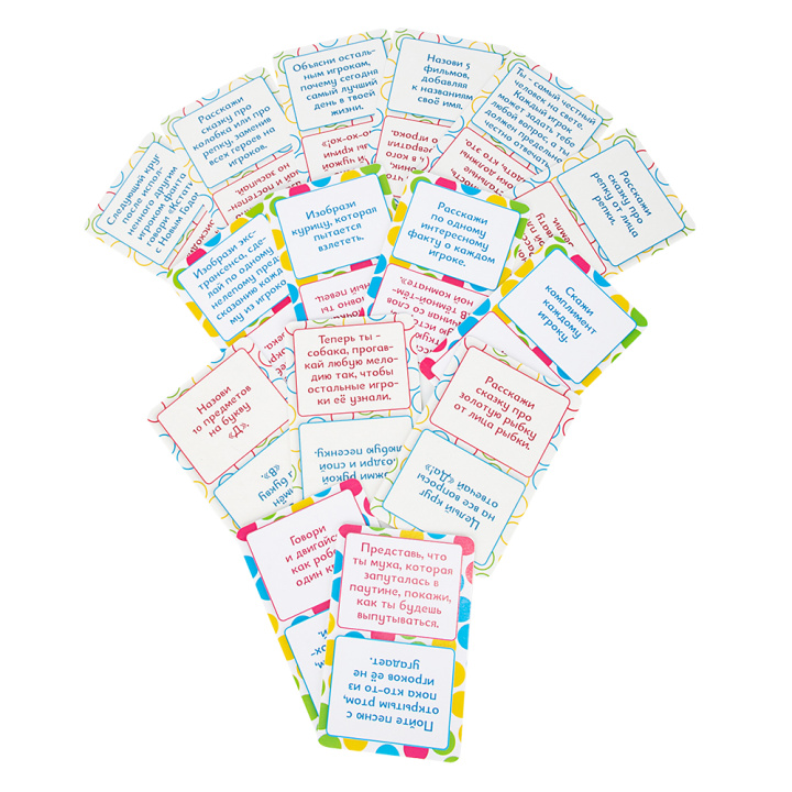 - "Фанты" игрокам предстоит выполнять весёлые задания, которые указаны на карточках;