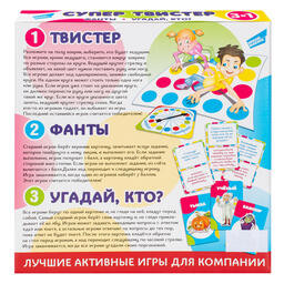 Лучшие активные игры для компании. "Твистер" – это весёлая игра для любой компании, в которой игроки поочерёдно ставят руки или ноги на цвета игрового коврика и пытаются удержать равновесие. В "Фантах" цель игры – выполнить как можно больше весёлых заданий. Мы собрали только самые лучшие и интересные задания. "Угадай, кто?" – весёлая игра, в которой вам необходимо угадать, кто изображён на вашей карточке.