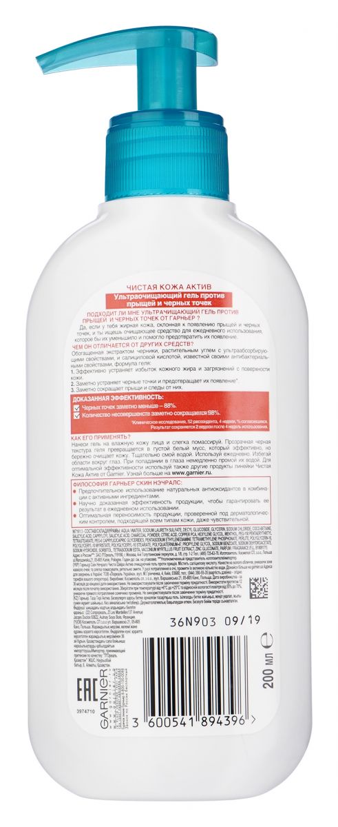 Garnier Ультраочищающий гель "Чистая кожа, Актив" против прыщей и черных точек, с абсорбирующим углем, 200 мл