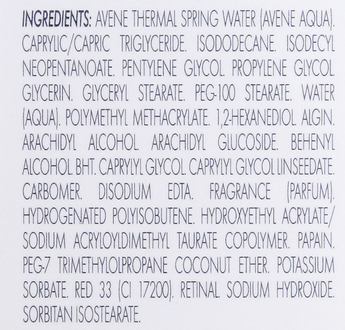 - Состав: AVENE THERMAL SPRING WATER (AVENE AQUA), CAPRYLIC/CAPRIC TRIGLYCERIDE, ISODODECANE, ISODECYL NEOPENTANOATE, PENTYLENE GLYCOL. PROPYLENE GLYCOL, GLYCERIN, GLYCERYL STEARATE, PEG-100 STEARATE, WATER (AQUA), POLYMETHYL METHACRYLATE, 1,2-HEXANEDIOL, ALGIN, ARACHYDYL ALCOHOL, ARACHIDYL GLUCOSIDE, BEHENYL ALCOHOL, BHT, CAPRYLYL GLYCOL, CAPRYLYL GLYCOL LINSEEDATE, CARBOMER, DISODIUM EDTA, FRAGRANCE (PARFUM), HYDROHENATED POLYSOBUTENE, HYDROXYETHYL ACRYLATE/SODIUM ACRYLOYL DIMETHYL TAURATE COPOLYMER, PAPAINE, PEG-7 TRIMETHYLOLPROPANE COCONUT ETHER, POTASSIUM SORBATE, CI 17200, RETINAL, SODIUM HYDROXIDE, SORBITAN ISOSTEARATE.