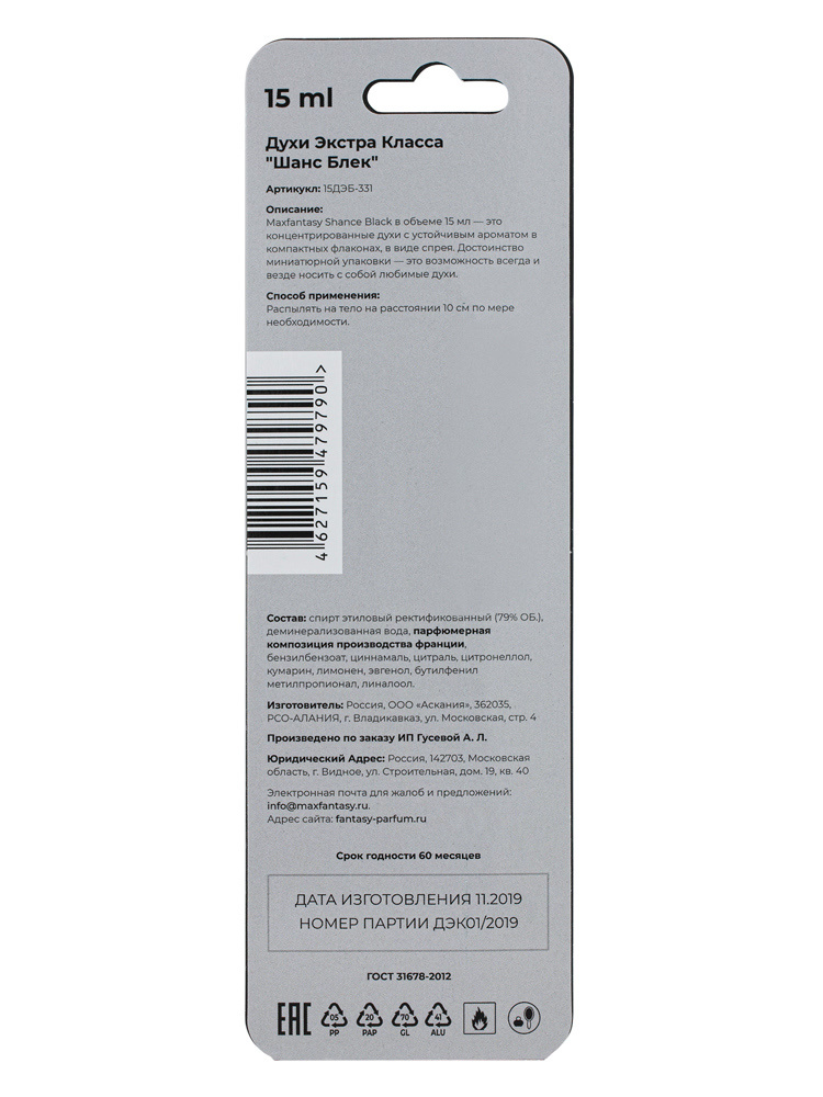 Maxfantasy Shance Black 15 мл №331 Парфюмерная вода 15 мл