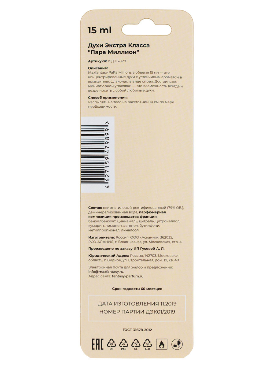 - Состав спирт этиловый ректификованный, деминерализованная вода, парфюмерная композиция