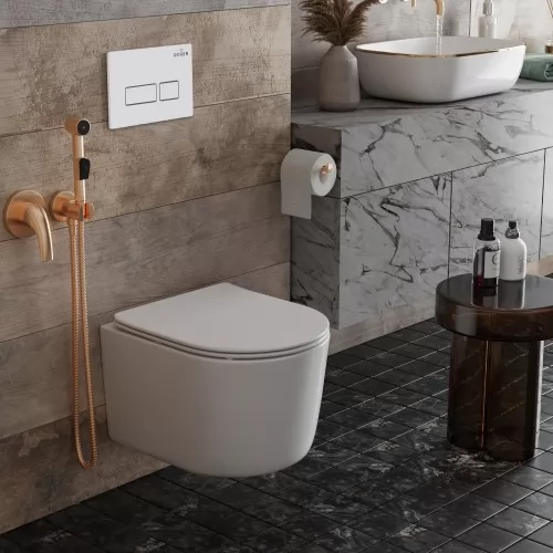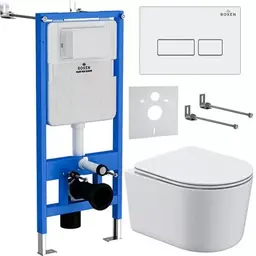 Комплект инсталляции 6 в 1 Roxen StounFix Slim 920247 с удлиненными креплениями в комплекте, шумоизоляционной плитой, кнопкой смыва Roxen Caspia 410280W и подвесным унитазом Roxen Simple Compact 530120-01 Rimless Soft Close.
