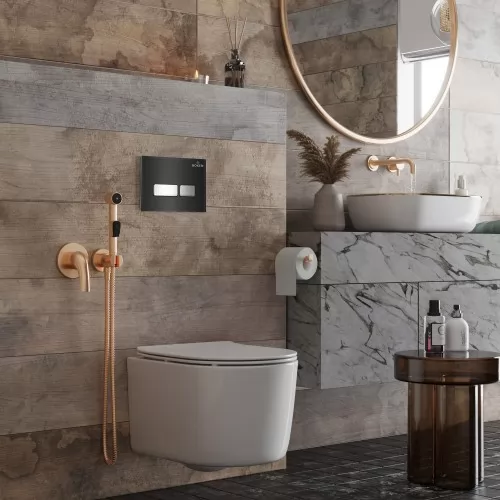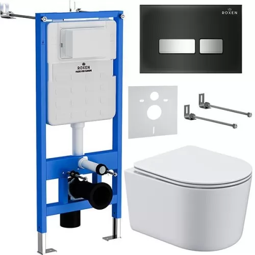 Комплект инсталляции 6 в 1 Roxen StounFix Slim 965318 с удлиненными креплениями в комплекте, шумоизоляционной плитой, кнопкой смыва Roxen Glass 430280B и подвесным унитазом Roxen Simple Compact 530120-01 Rimless Soft Close.