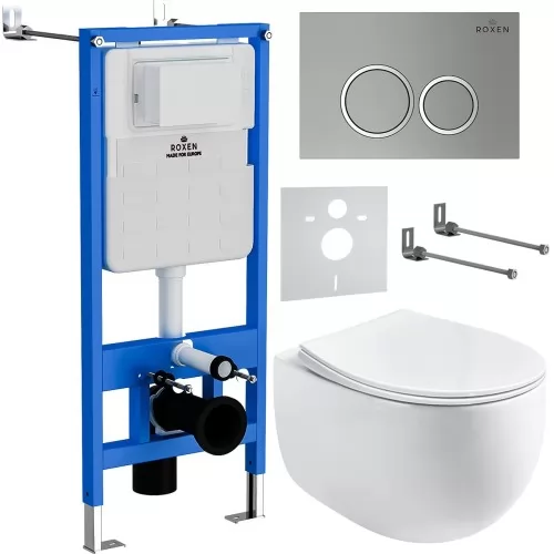 Комплект инсталляции 6 в 1 Roxen StounFix Slim 964076 с удлиненными креплениями в комплекте, шумоизоляционной плитой, кнопкой смыва Roxen Santi 410260M и подвесным унитазом Roxen EGG 530170-01 Rimless Soft Close.