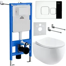 Комплект инсталляции 6 в 1 Roxen StounFix Slim 964100 с удлиненными креплениями в комплекте, шумоизоляционной плитой, кнопкой смыва Roxen Santi 410280CH и подвесным унитазом Roxen EGG 530170-01 Rimless Soft Close.