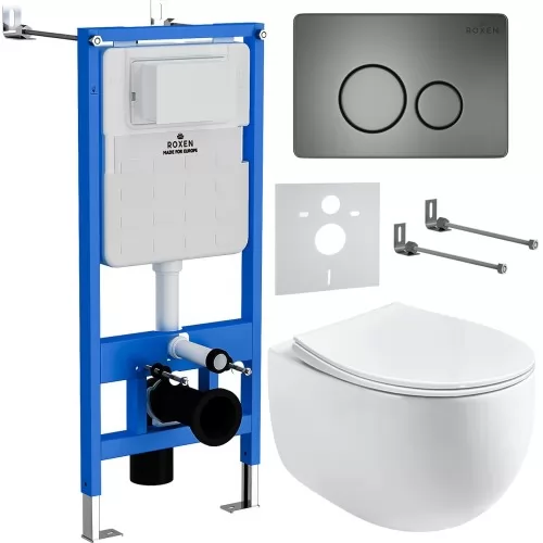 Комплект инсталляции 6 в 1 Roxen StounFix Slim 964237 с удлиненными креплениями в комплекте, шумоизоляционной плитой, металлической кнопкой смыва Roxen Steel 420260G и подвесным унитазом Roxen EGG 530170-01 Rimless Soft Close.
