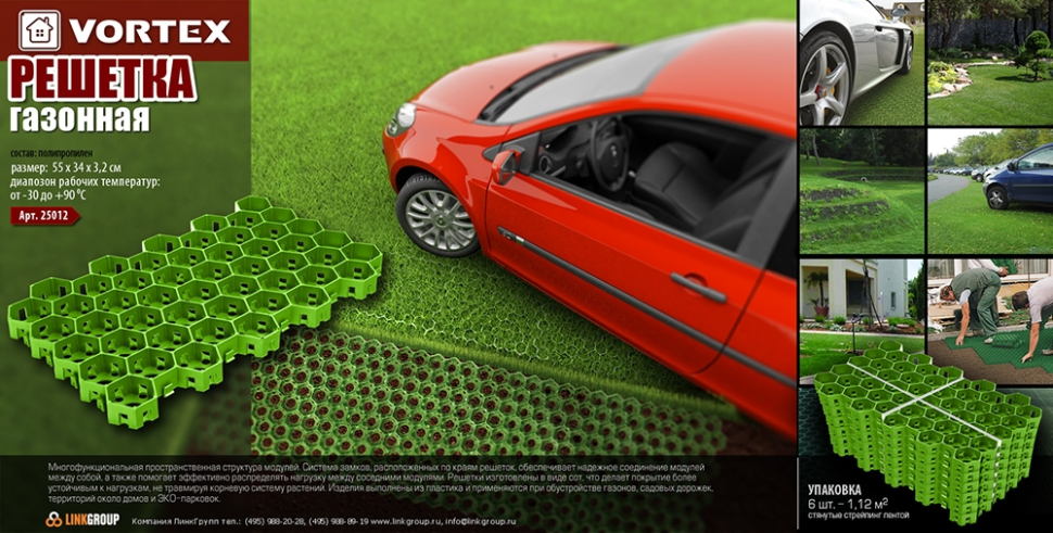 Заводская упаковка нарушена или отсутствует. Товар НОВЫЙ, в полной комплектации. / Легко устанавливается и надежно защищает газоны и клумбы от повреждений. Система замков, расположенных по краям решетки, делает её долговечной и устойчивой к нагрузкам. Выдерживает вес автомобиля, что снижает нагрузку на почву и способствует росту травы, камеры решетки удерживают больше влаги. Рабочий диапазон температур от -30с до +50с. Размер: 55 х 34 х 3,2 см.