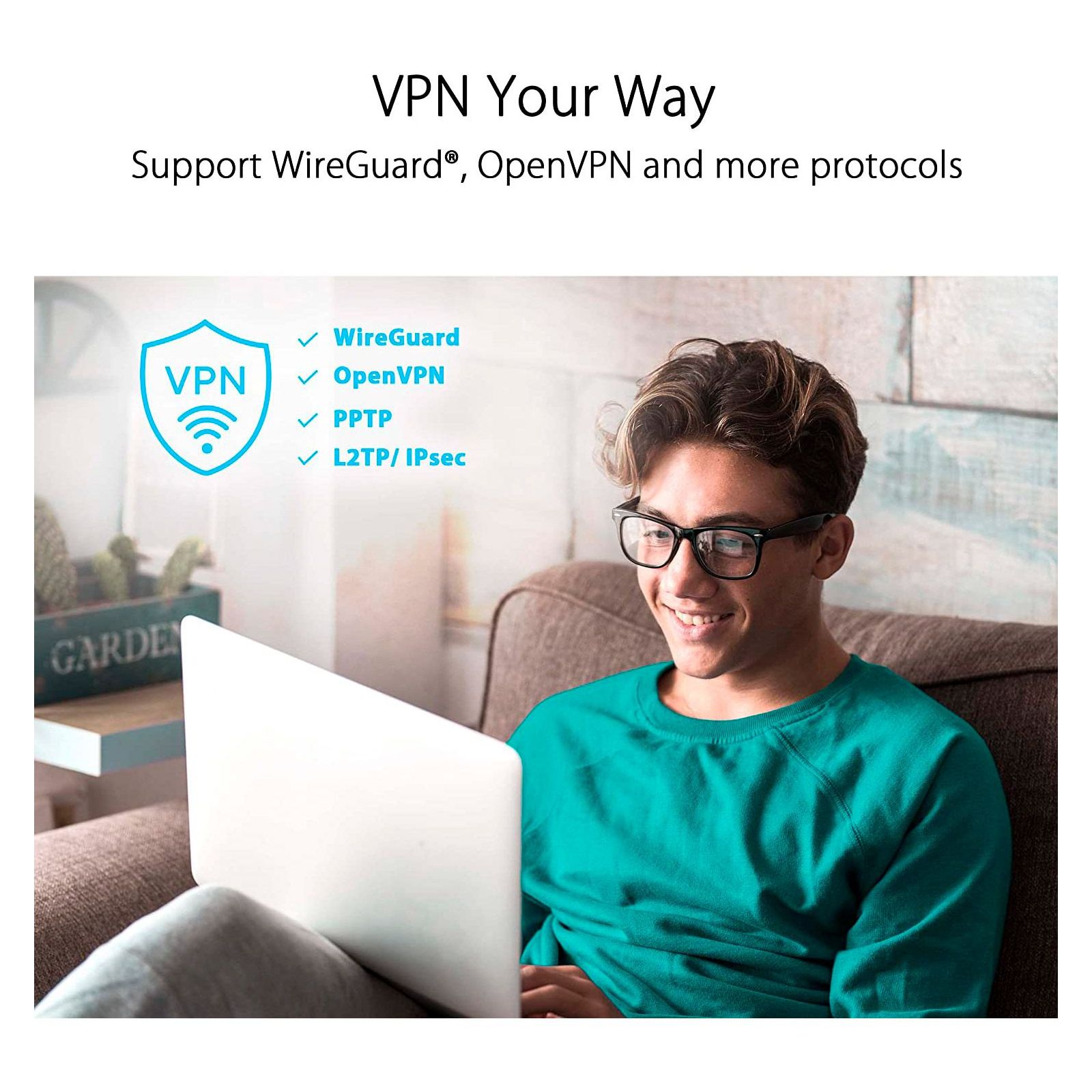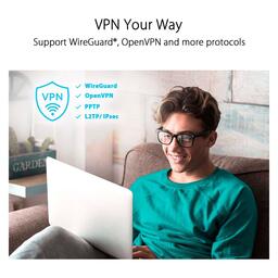 Маршрутизатор ASUS RT-AX5400 дає змогу віддаленим працівникам безпечно отримувати доступ до корпоративних мереж без необхідності встановлювати програмне забезпечення для VPN на кожному пристрої. Ви можете створювати різні типи VPN-з’єднаннь, зокрема PPTP, L2TP, OpenVPN і WireGuard. За допомогою VPN Fusion також можна призначати різні пристрої до різних тунелів VPN, одночасно зберігаючи звичайне підключення до Інтернету для регулярного використання.