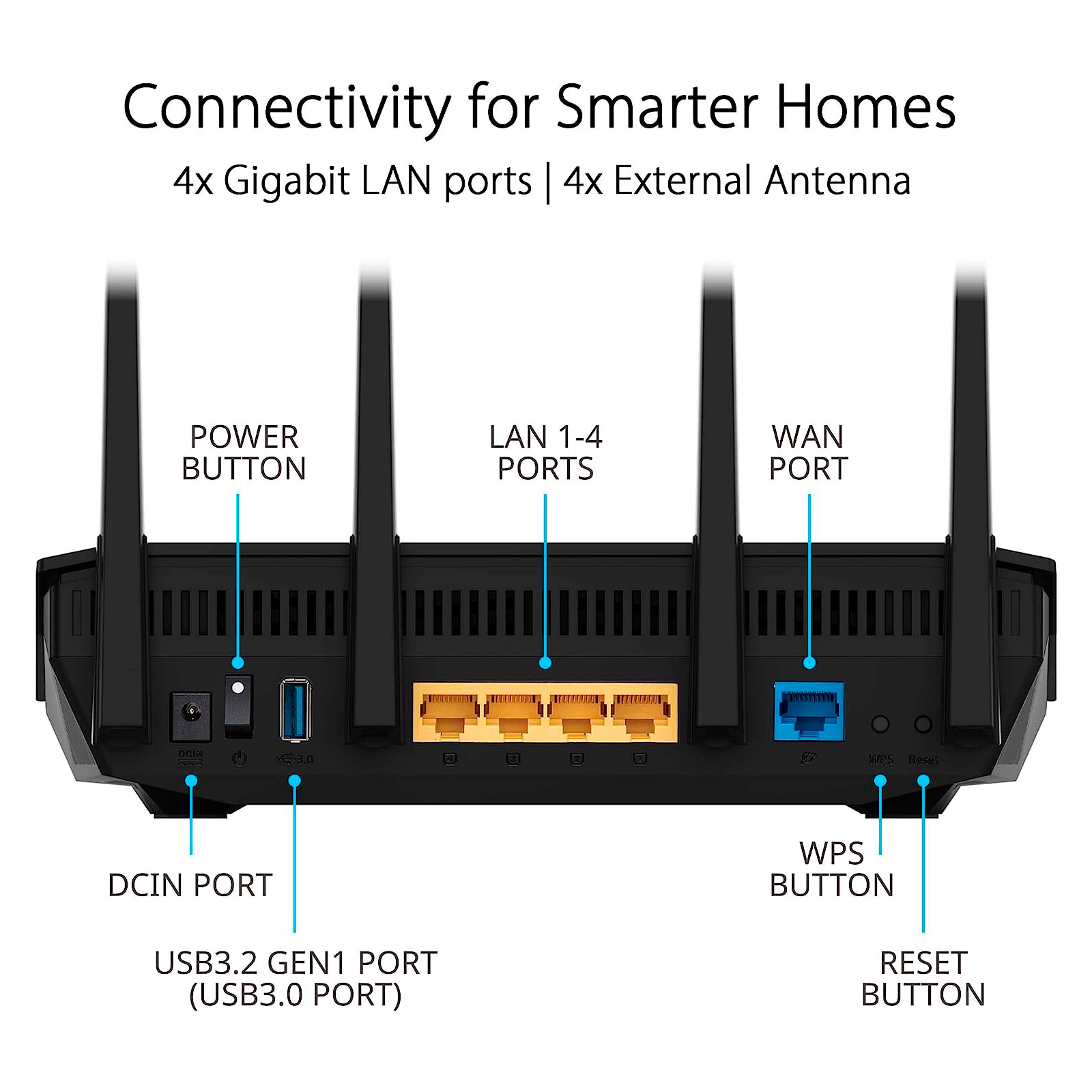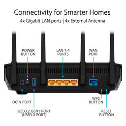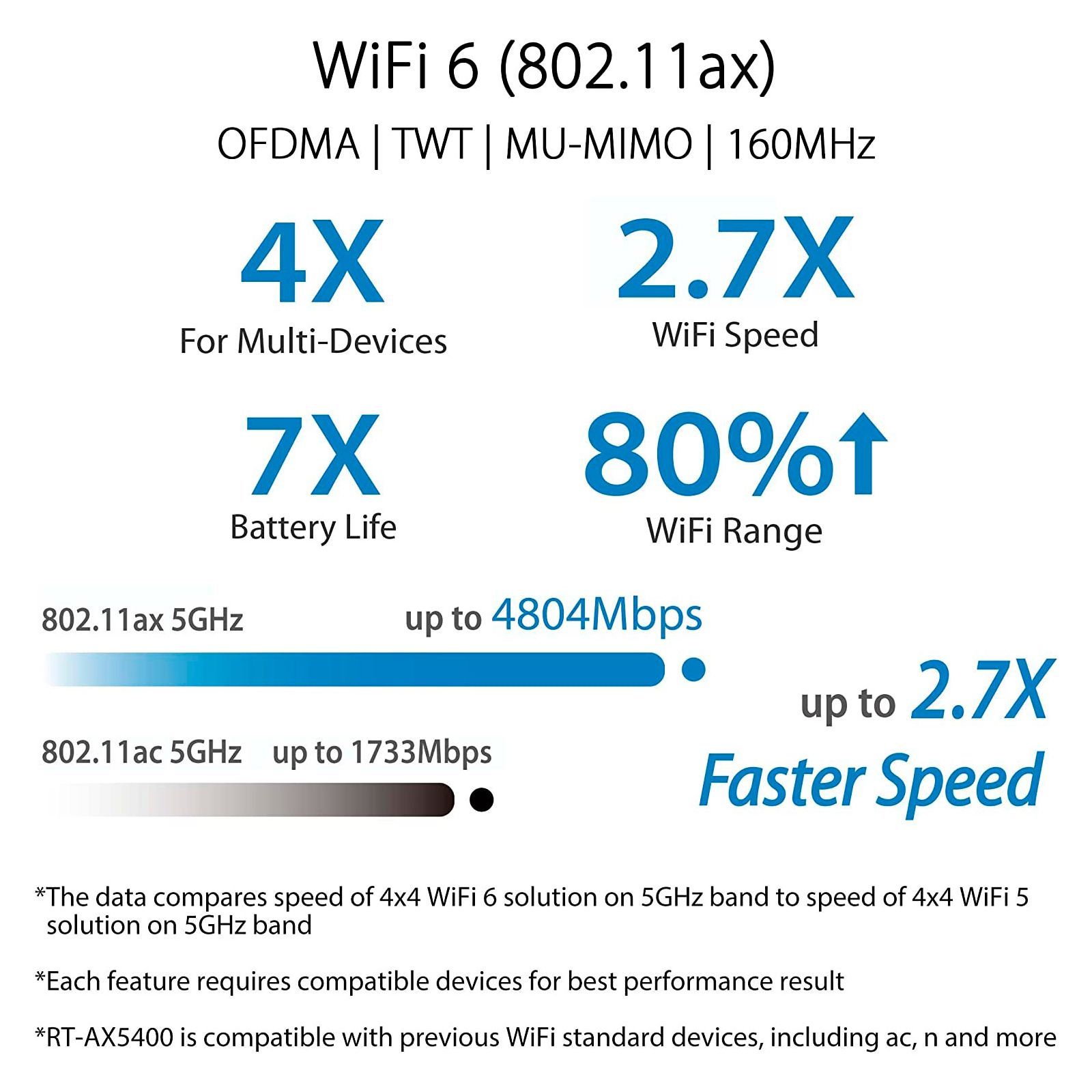 Завдяки вбудованому комплексному VPN-захисту, який забезпечується сучасними технологіями безпеки ASUS, маршрутизатор RT-AX5400 перевершить усі ваші очікування і стане ідеальним помічником у роботі з наявними WiFi-пристроями.