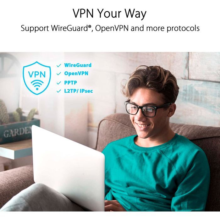 Насолоджуйтесь безпечним і швидким підключенням для потокових трансляцій, ігор та інших завдань за допомогою маршрутизатора ASUS RT-AX5400 і VPN-з’єднання. За допомогою програми ASUS Router для мобільних пристроїв і вебінтерфейсу ви можете легко налаштувати VPN-з’єднання, зокрема з використанням протоколів OpenVPN і WireGuard, щоб вони відповідали вашим вимогам.