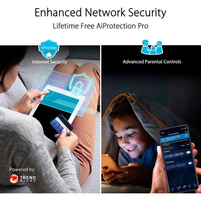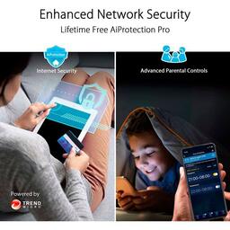 Окрім підтримки найновішого протоколу безпеки WPA3, ASUS RT-AX5400 містить у собі систему інформаційної безпеки AiProtection Pro на основі розробок компанії Trend Micro, яка забезпечує захист від інтернет-загроз для всіх підключених до неї пристроїв.