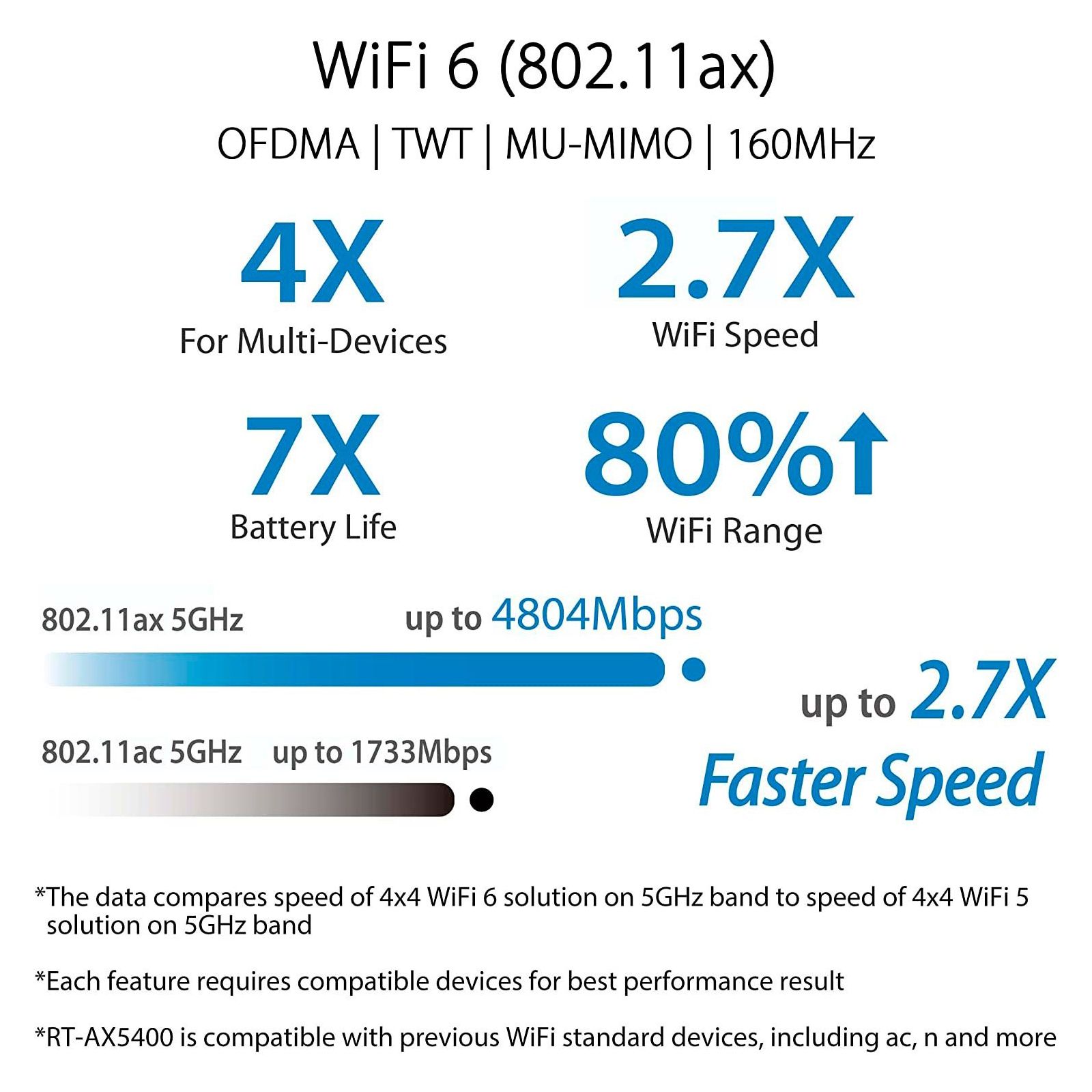 Маршрутизатор RT-AX5400 працює за стандартом Wi-Fi 6, забезпечуючи швидкий і стабільний доступ до Інтернету для зростаючої кількості розумних пристроїв у вашому домі. Завдяки підвищеній швидкодії, ефективності та пропускній здатності ви зможете під'єднати до мережі стільки пристроїв, скільки вам необхідно, насолоджуючись найвищою швидкістю Wi-Fi.