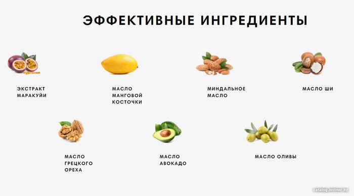 • Состав Water/Aqua, Prunus Amygdalus Dulcis (Sweet Almond) Oil, Butyrospermum Parkii (Shea) Butter, Sodium Acrylates Copolymer, Lecithin, Glyceryl Stearate, Cetearyl Alcohol, Sodium Lauroyl Glutamate, Sodium Stearoyl Lactylate, Dicaprylyl Ether, Caprylic/CapricTriglyceride, Phenoxyethanol, Olea Europaea (Olive) Fruit Oil, Passiflora Edulis Seed Oil, Persea Gratissima (Avocado) Oil, Juglans Regia (Walnut) Seed Oil, Mangifera Indica (Mango) Seed Butter, Parfum, Allantoin, Glycerin, Mangifera Indica (Mango) Fruit Extract, Carica Papaya (Papaya) Fruit Extract, Tocopherol, Beta-Sitosterol, Squalene, Potassium Sorbate, Sodium Benzoate.