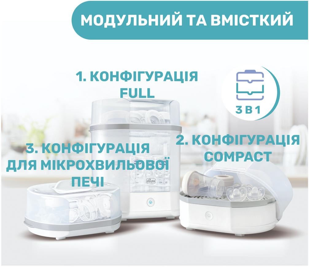 • Комплектація 2 контейнери для пляшечок та аксесуарів, стерилізатор в двох варіантах: повномірний, компактний