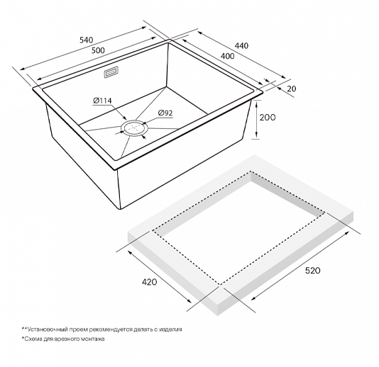 Способ монтажа: под столешницу, вровень со столешницей, в столешницу сверху