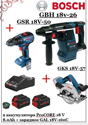 КОМПЛЕКТ BOSCH: Перфоратор GBH 18V-26 (18V, 2.6 Дж, ЕС-Motor, Solo-версия) + Шуруповёрт GSR 18V-50 (18V, 50 Нм, ЕС-Motor, Solo-версия) + Аккумуляторы ProCORE18V 8.0 Ah (2 шт) + зарядное GAL 18V-160C+дисковая пила GKS 18V-57(18V, пропил:57мм)