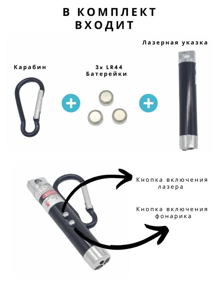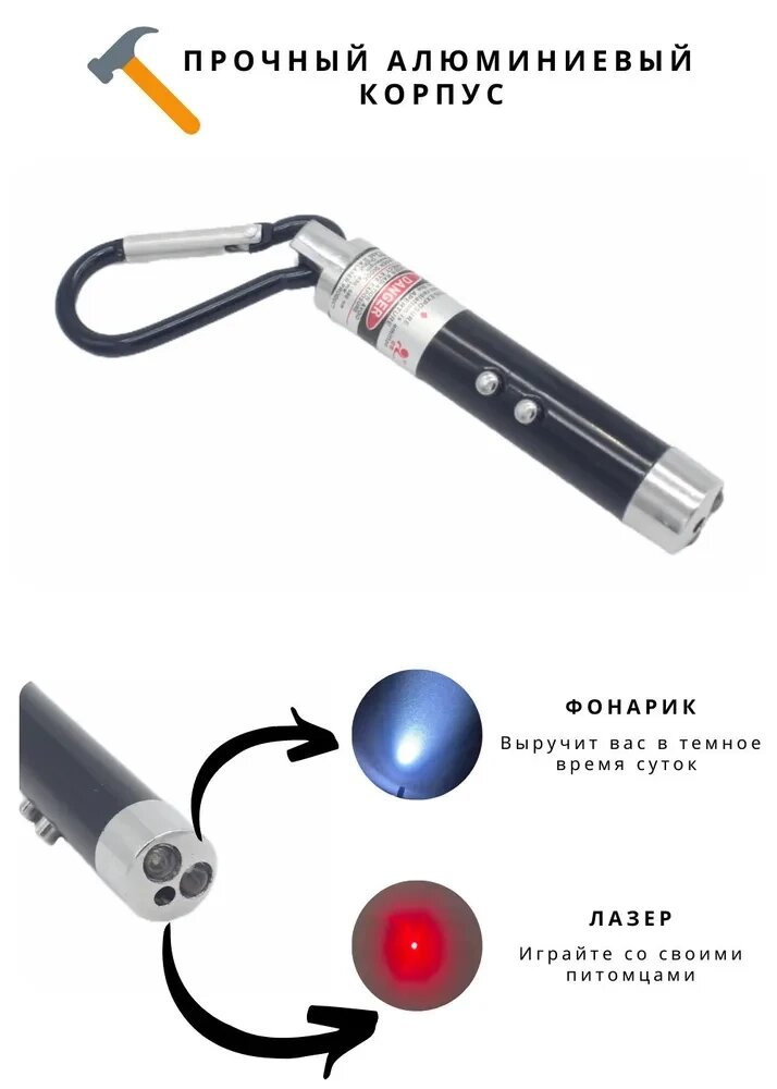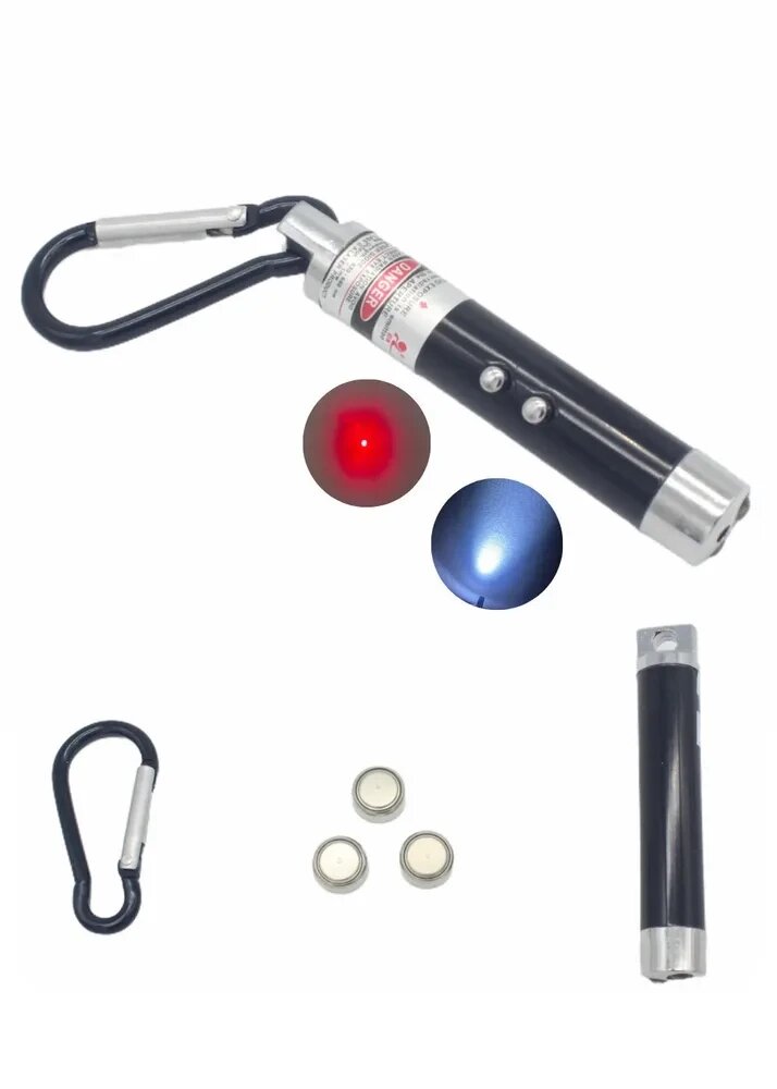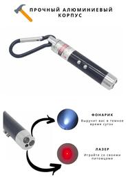 Лазерная указка для кошек и собак с карабином и фонариком, черная. Зоотовар для игры с домашним питомцем