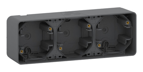 MUREVA S, 3-х ПОСТОВОЙ БОКС для накл. монтажа, АНТРАЦИТ, IP55. тип устройства или его аксессуаров: короб для установки на поверхности. Преимущества: Работоспособность: Пыле-влагозащита по стандарту IP55 означает, что Mureva Styl защищена от попадания воды и пыли внутрь механизмов... Простота установки: Монтаж Mureva Styl достаточно прост благодаря продуманному дизайну креплений. Инновационный и интуитивный дизайн креплений основывается на продвинутой эргономике, минимуме частей, которые вщёлкиваются в устройства, и щедром количестве пространства, которое помогает удобно располагать провода.... применения: Надежная серия Mureva Styl отлично подходит для внешних сред, где основным. фактором являются жесткие условия. Надежная серия Mureva Styl отлично подходит для внешних сред, где основным фактором являются жесткие условия. Интегрированная защита IP говорит о том, что данная серия является идеальным решением для гаражей, подвальных помещений, парковок автомобилей и электрически чувствительных сред, таких как прачечные, кухни и ванные комнаты, а также помещения с угрозой механического воздействия, например производственные цеха и спортзалы....