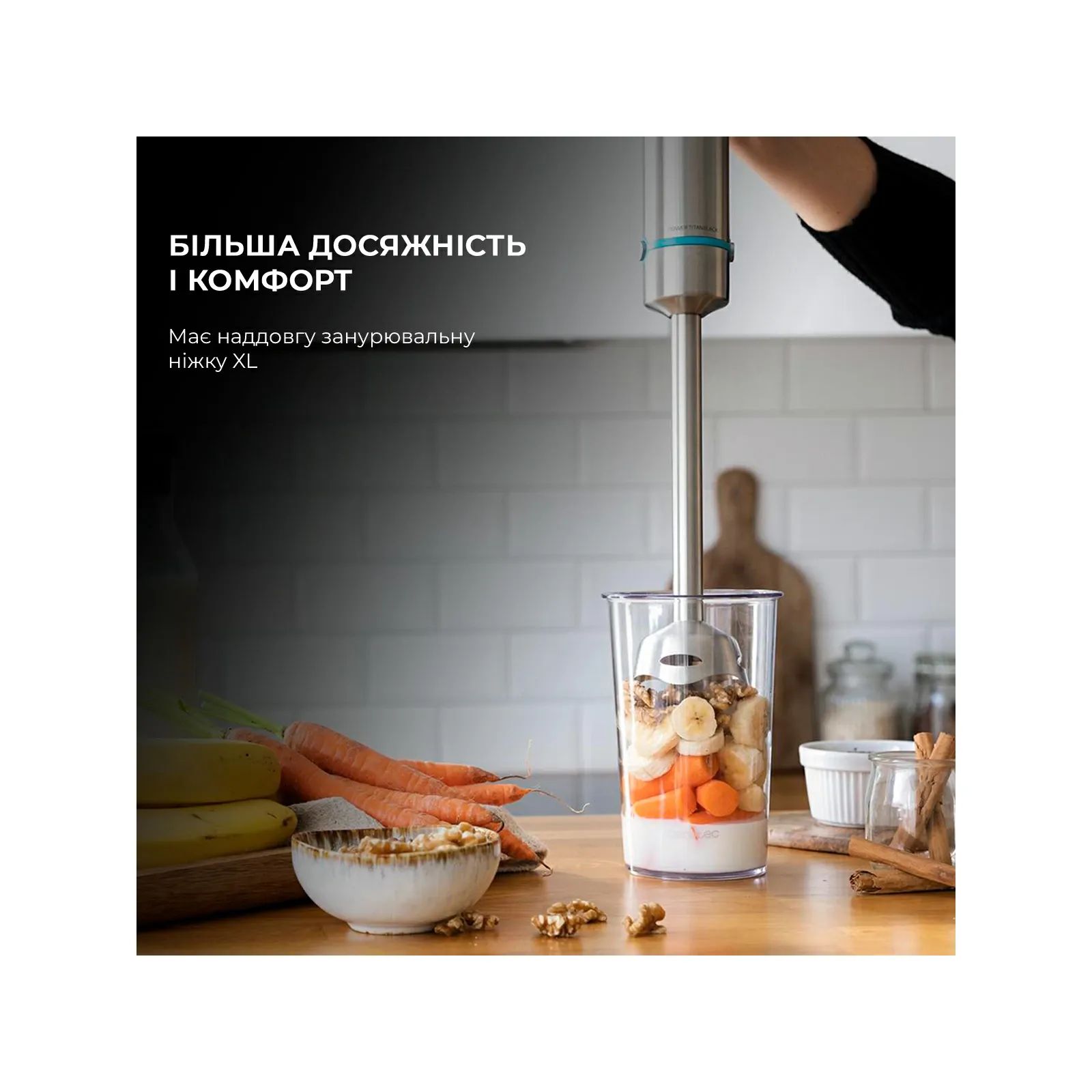 Знімна стопа блендера має збільшену довжину XL розміру, за рахунок чого краще змішати або подрібнити інгредієнти в глибокому посуді. Також завдяки довгій нозі блендер дозволяє робити кухонні дії без забруднення навколишнього інтер'єру та інших приладів, робочої поверхні.