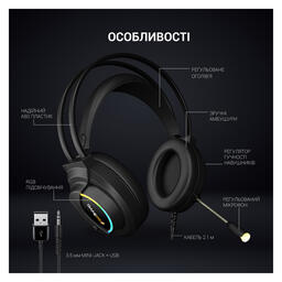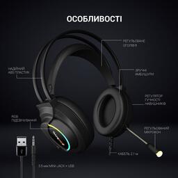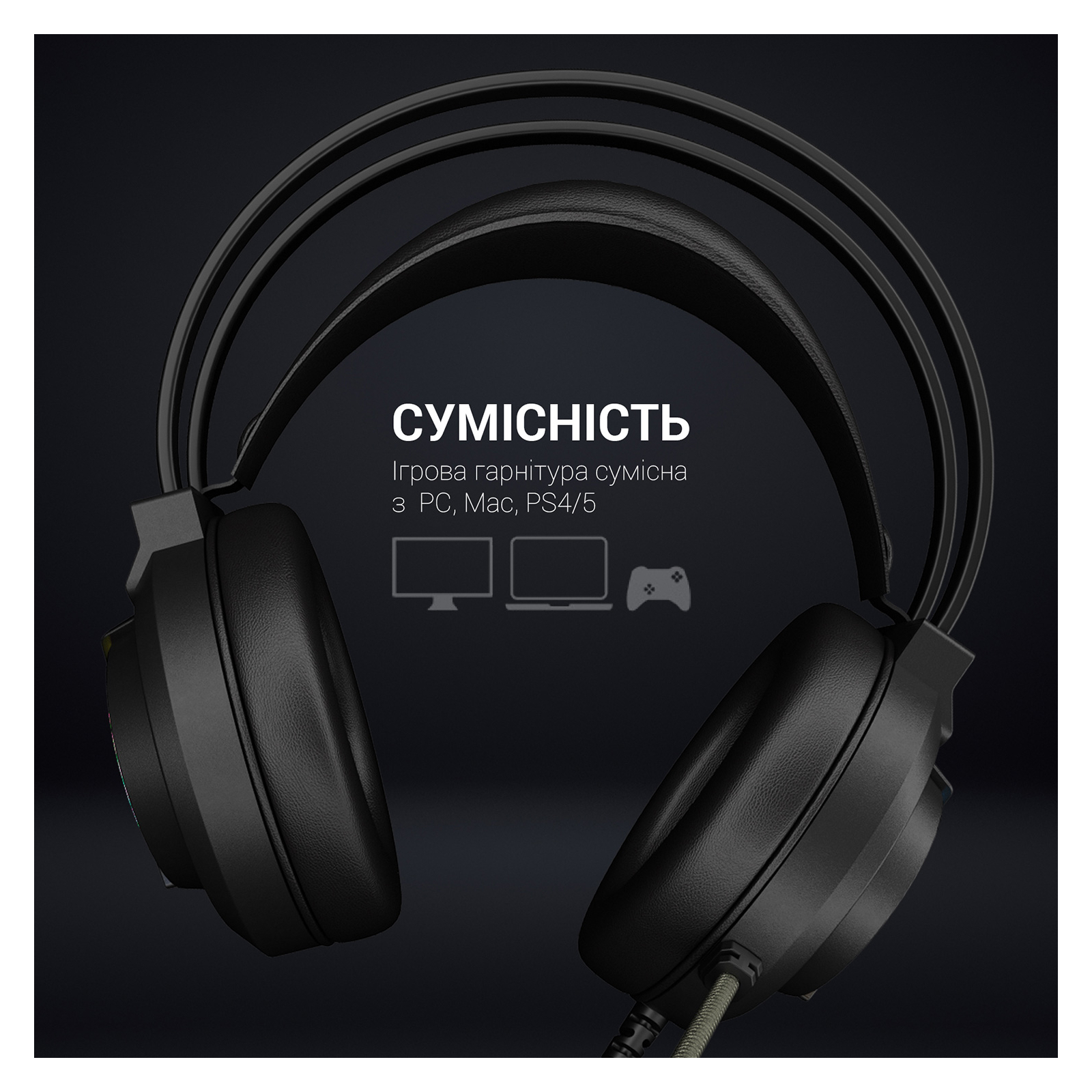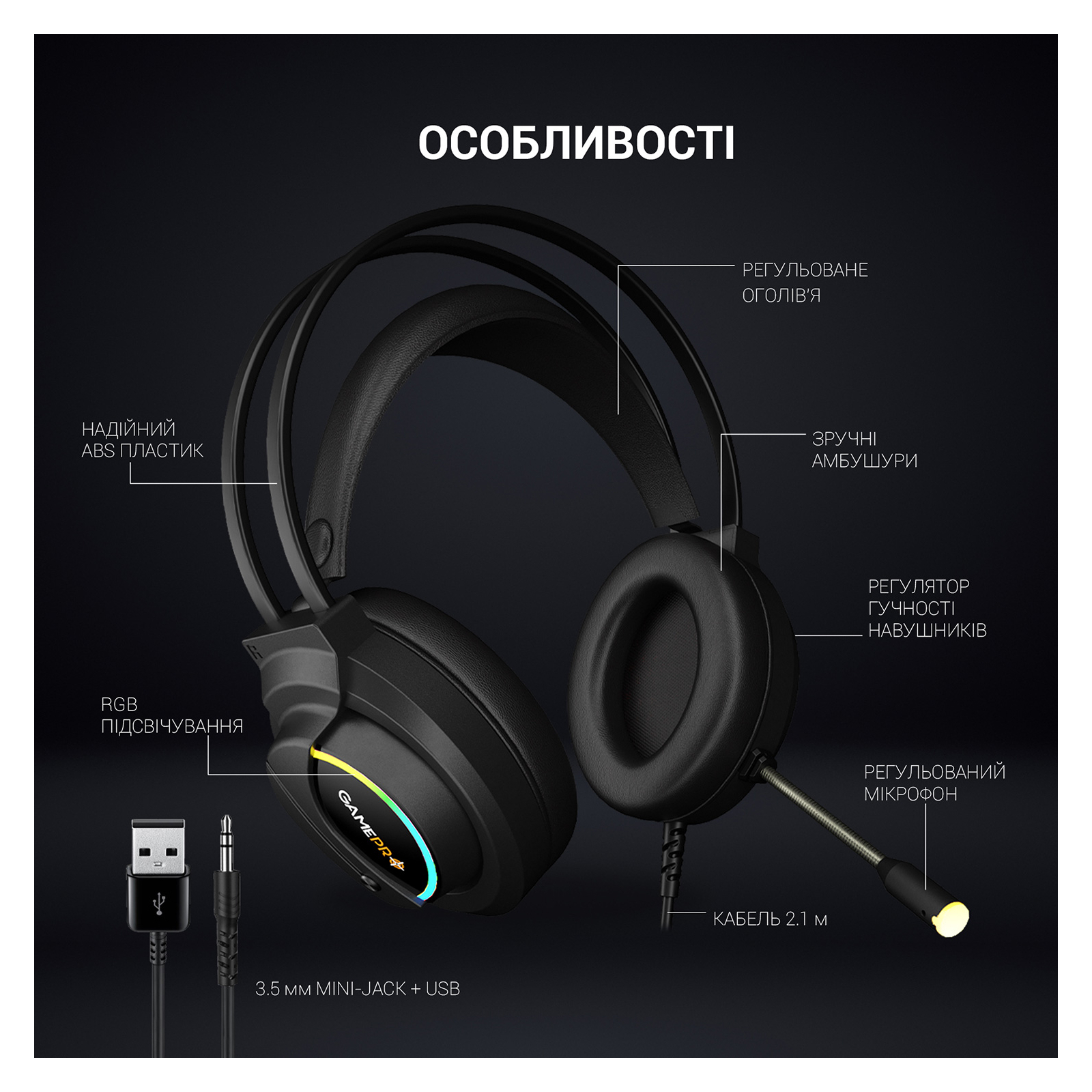 GamePro Headshot HS565 - повнорозмірна геймерська гарнітура, яка допоможе максимально зануритися у віртуальні ігрові сюжети. Аксесуар порадує високою якістю відтворення звуку, чутливим мікрофоном для голосового спілкування та ергономічним форм-фактором. А стильний корпус зі світлодіодним підсвічуванням додає пристрою елегантності.