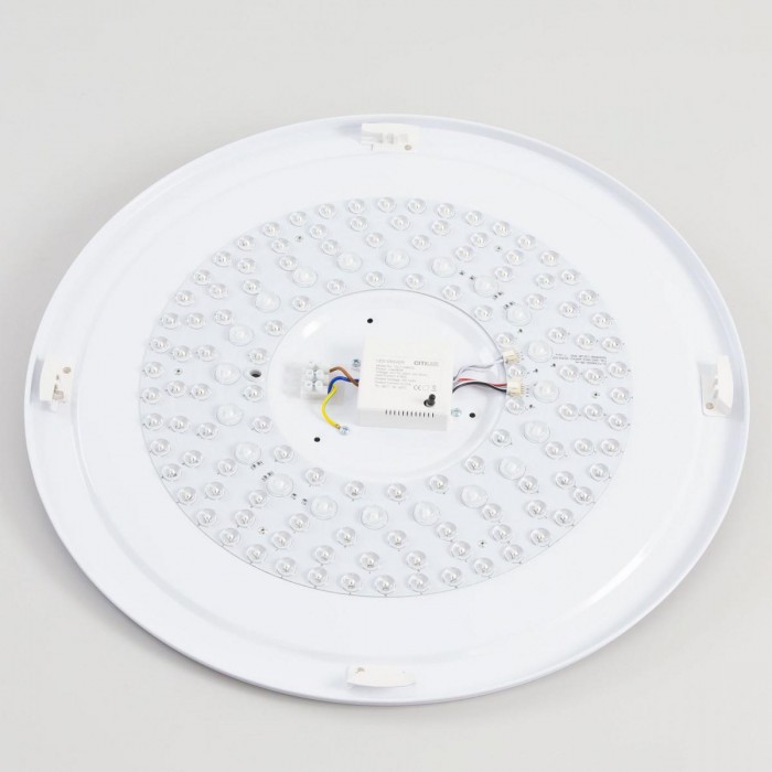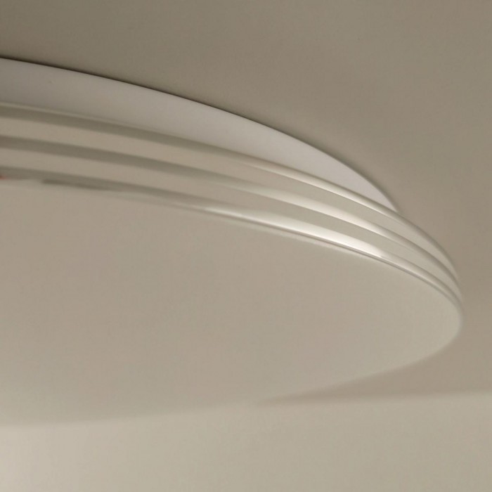 Светодиодная потолочная люстра Citilux Симпла CL714900G с яркой цветной RGB подсветкой всего плафона. Светильник плоский, круглой формы. Основание металлическое, плафон белый матовый из оптического полимера, с изящной хромированной окантовкой. Мощность 90Вт, световой поток 7700Лм. Модель с пультом дистанционного управления. Доступна плавная регулировка яркости от 100 до 10%. Плавная регулировка цветовой температурой освещения в диапазоне от 3000К до 5500К, позволяет настроить любые оттенки теплого, нейтрального или холодного света. Цветная RGB подсветка имеет различные режимы работы. Таймер - функция отсроченного на 20сек. выключения. Четыре кнопки памяти позволяют сохранить настроенные режимы работы и включать их с пульта или обычным настенным выключателем. Пульт ДУ инфракрасный в комплекте, тип батареек ААА (батарейками не комплектуется).