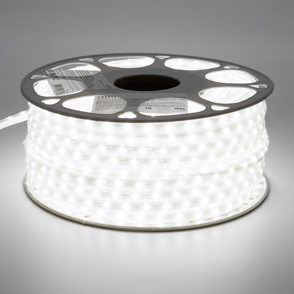 Лента светодиодная 220V SAFFIT SST20 , 60*SMD2835, 6W/m, IP65, 4000К (нейтральный белый), в комплекте сетевой шнур, Кратность резки мм 1000мм, раб.t -40°C...+40°C, бобина 50 метров*9мм*6 мм