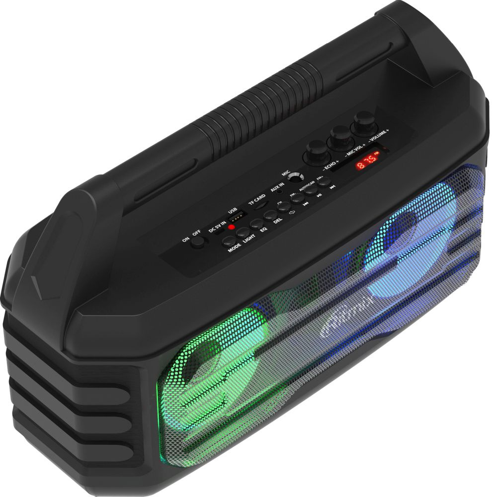 ОписаниеПортативная Bluetooth-колонка, имеющая AUX-вход, 6,3 мм вход для микрофона и встроенный FM-радиоприёмник, а также способная воспроизводить музыку с карточки microSD или USB-флешки.