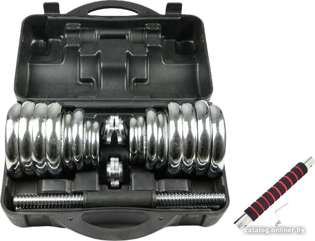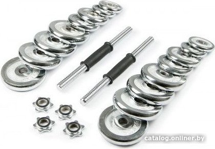 Комплектация- 2 грифа диаметром 26 мм, длиной 35 см (длина резьбы 11 см с каждой стороны) и весом 1,35 кг- 4 зажима, которые обеспечивают точные нагрузки давления- 4 диска х 0,5 кг (диаметр 9,5 см, ширина 1,4 см)- 4 диска х 1,25 кг (диаметр 11 см, ширина 1,8 см)- 8 диска х 2,5 кг (диаметр 15 см, ширина 2,2 см)- 1 соединительный гриф