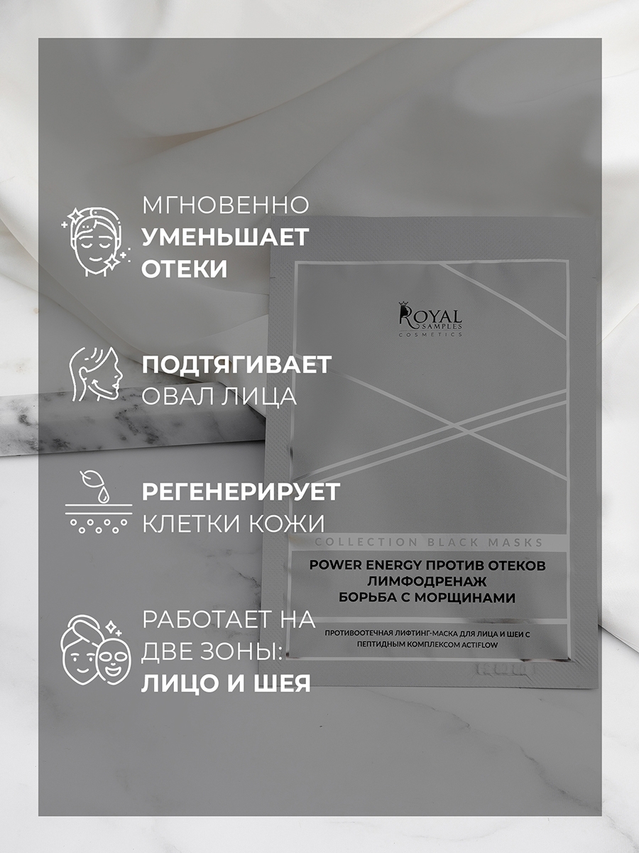 Royal Samples Collection Black Masks Power Energy Противоотечная тканевая лифтинг-маска для лица и шеи с комплексом пептидов