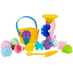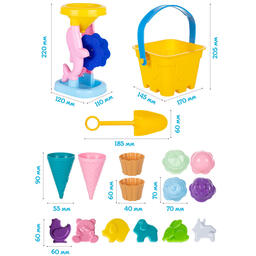 В наборе: ведёрко 1 шт., формочки "Зверята" 6 шт., формочки "Кексики" 4 шт., формочки "Мороженое" 4 шт., лопатка 1 шт., песочная мельничка 1 шт.