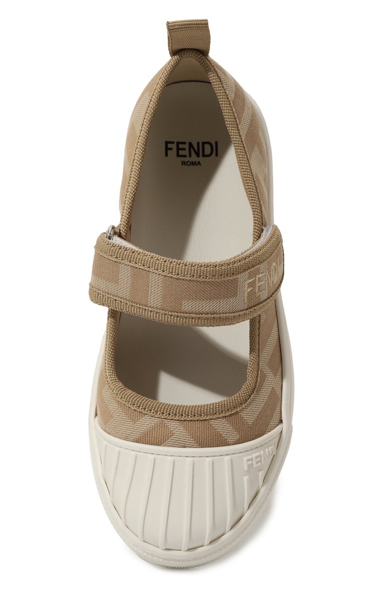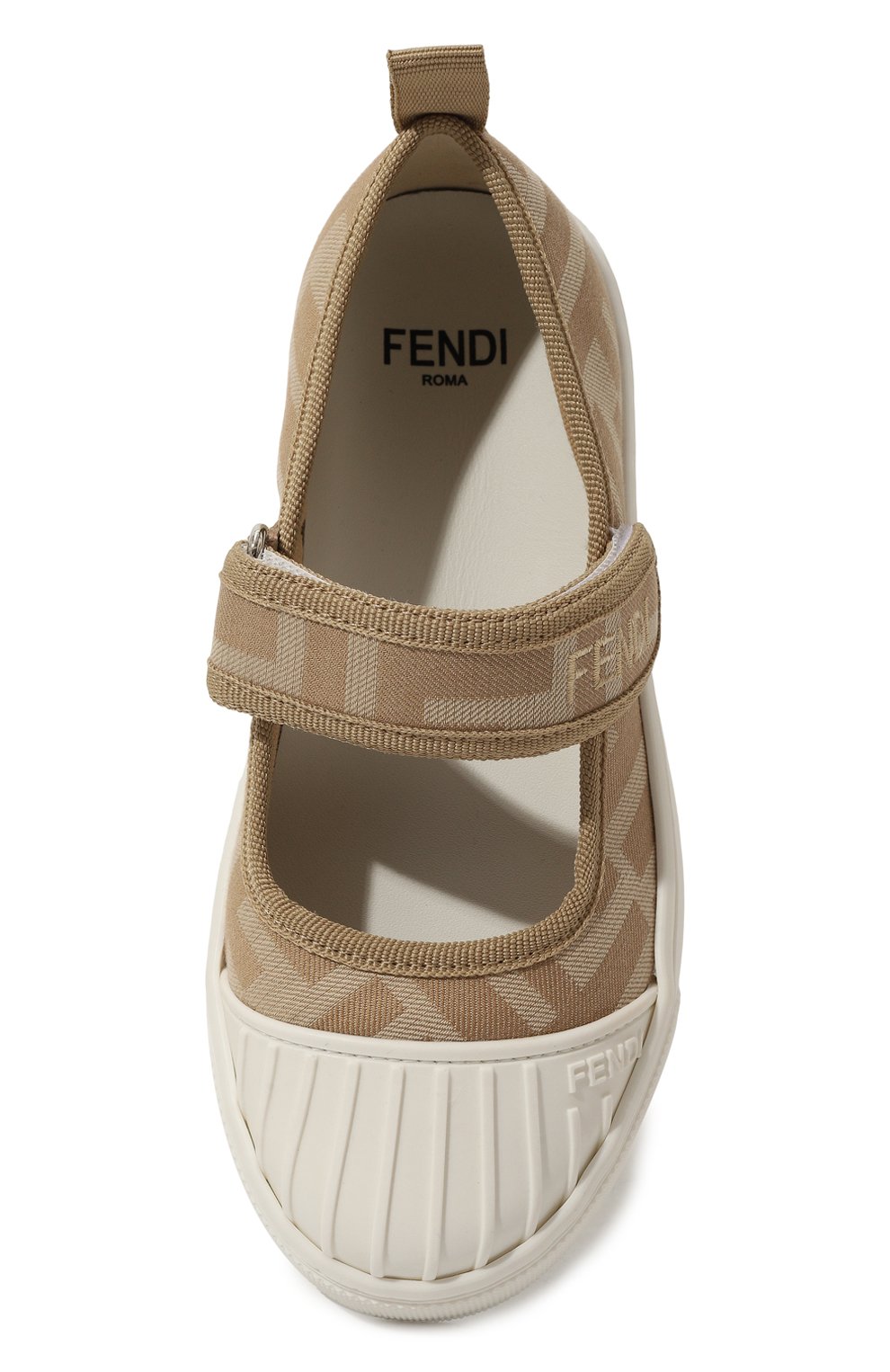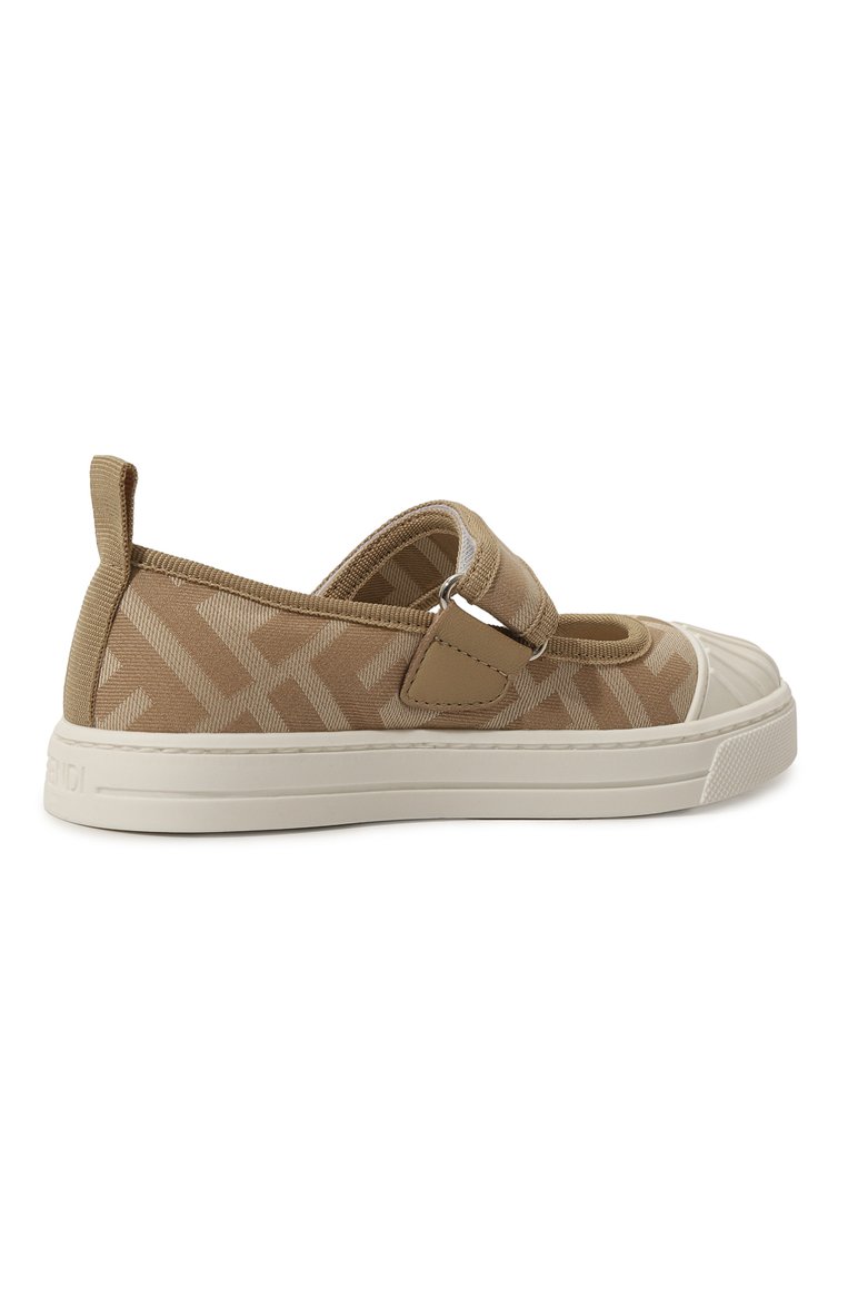 Для изготовления бежевых балеток с фактурной прорезиненной деталью на союзке использовали мягкий прочный текстиль. Жаккардовый паттерн из монограммы поддержали вышитым логотипом на ремешке с застежкой велкро. Пару установили на широкую гибкую подошву, уменьшающую риск поскользнуться.