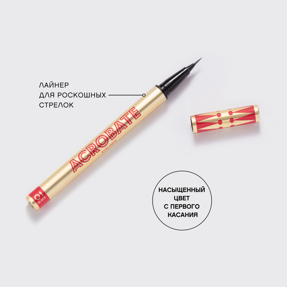 Acrobate eyeliner — его легендарное соло оставит незабываемое впечатление. Благодаря ультратонкому аппликатору-кисточке ты нарисуешь аккуратные линии. Лайнер мягко наносится и помогает создать грациозный образ. Водостойкая насыщенная текстура держится весь день, не трескается и не отпечатывается.