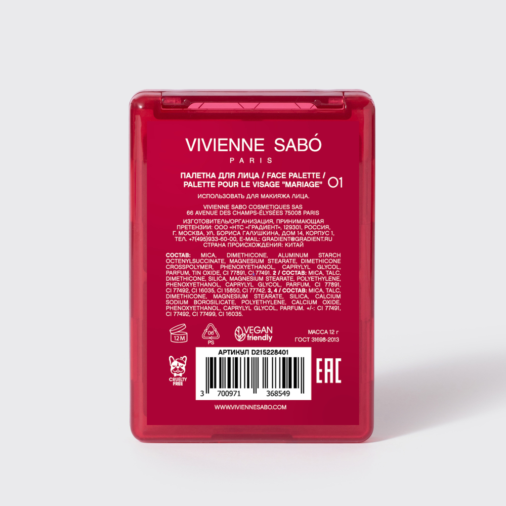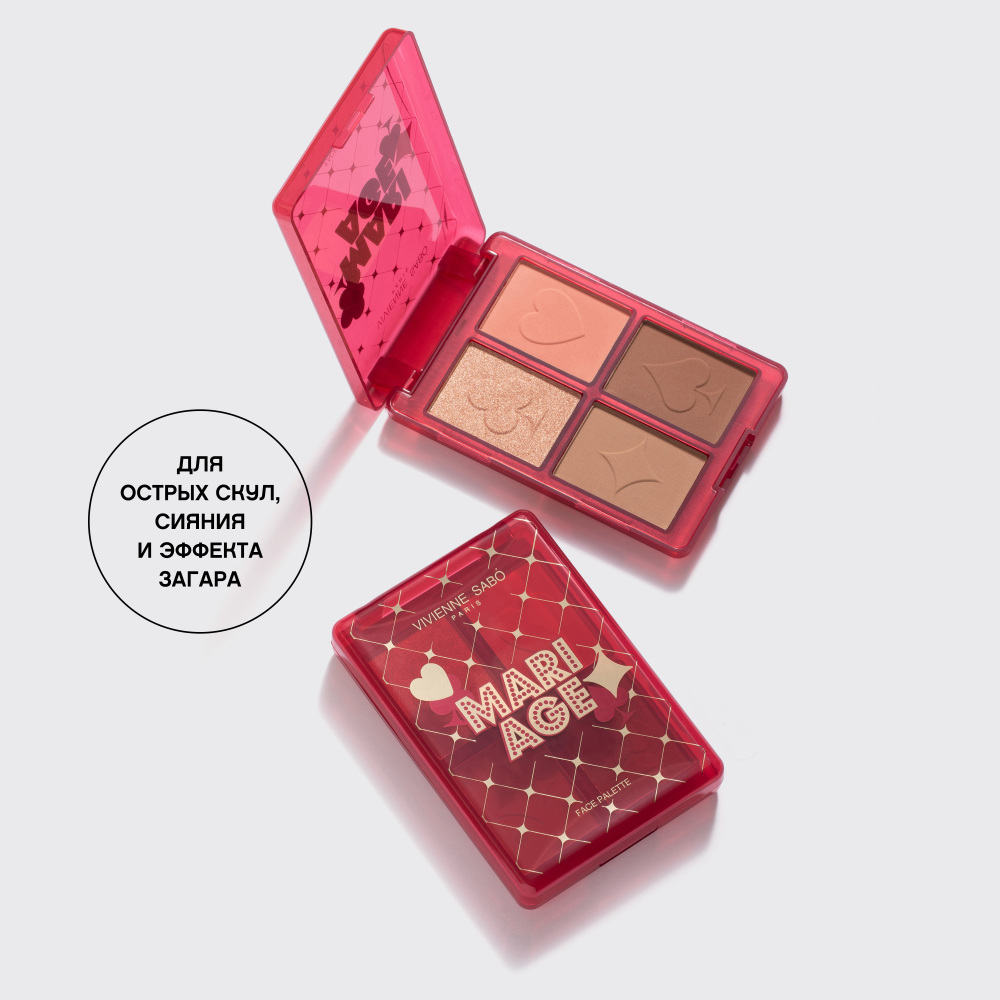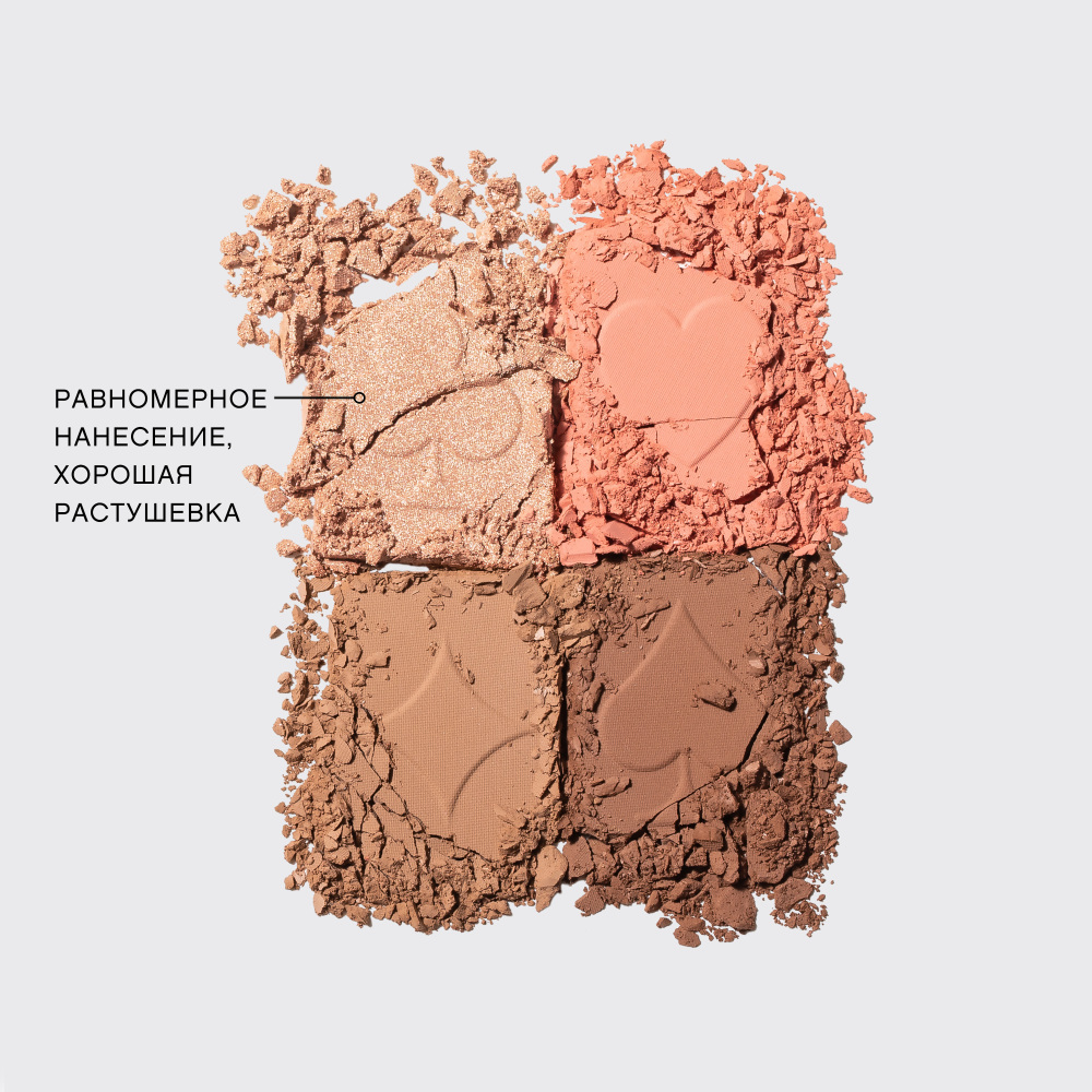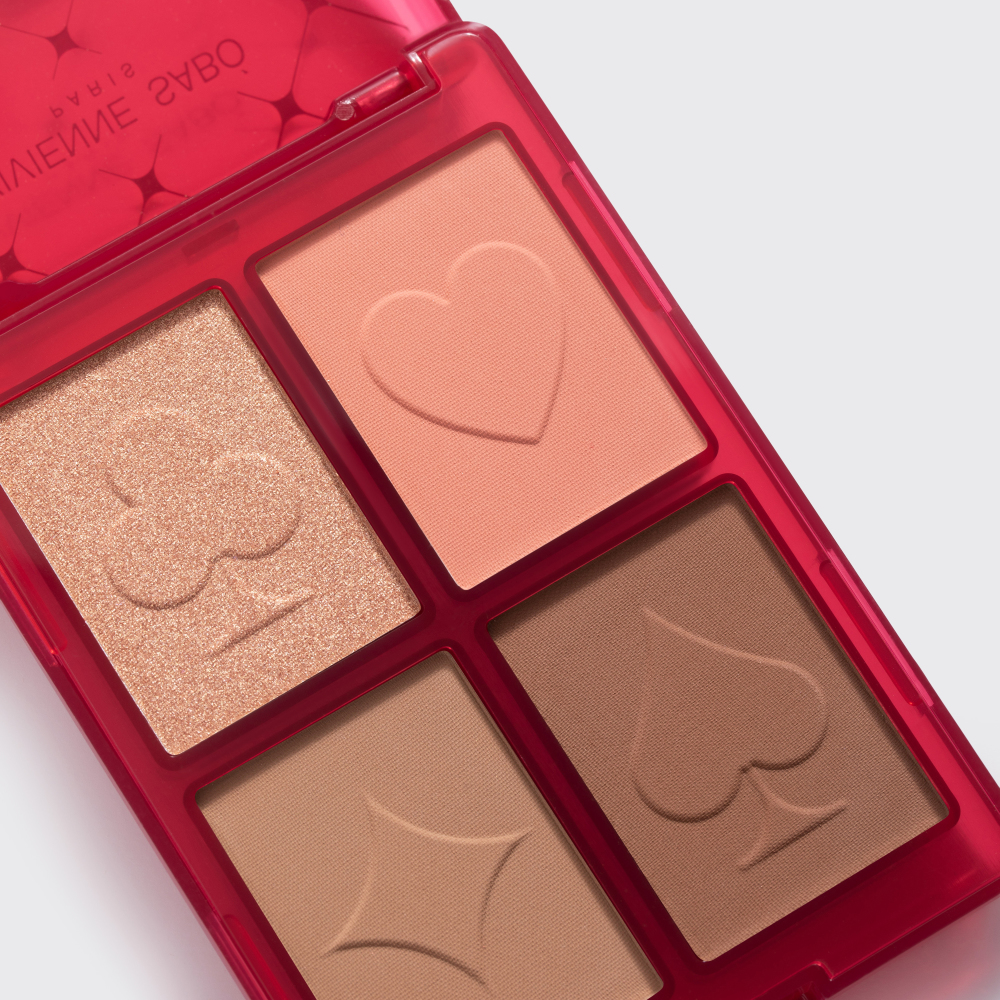 Mariage face palette — все для контуринга в одной палетке. С «Крестовой дамой» создай роскошное сияние, «Бубновой дамой» подчеркни скулы, с помощью «Червонного короля» добавь румянец и освежи лицо, а с «Королем пик» тебе обеспечен эффект загара. Все текстуры легко растушевываются и равномерно наносятся на кожу.