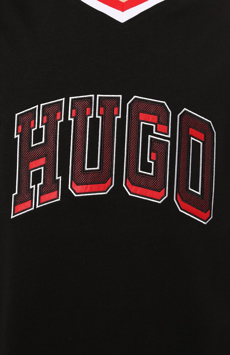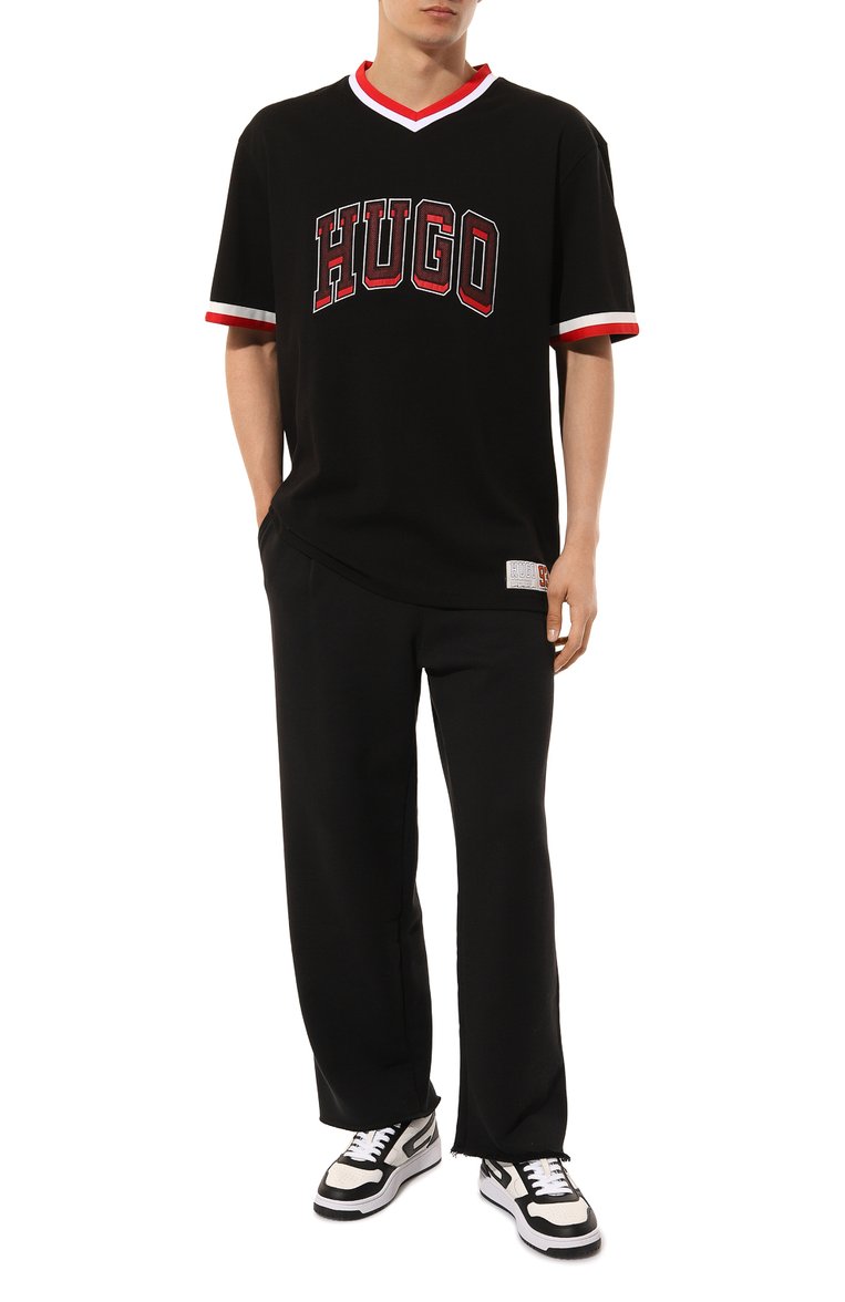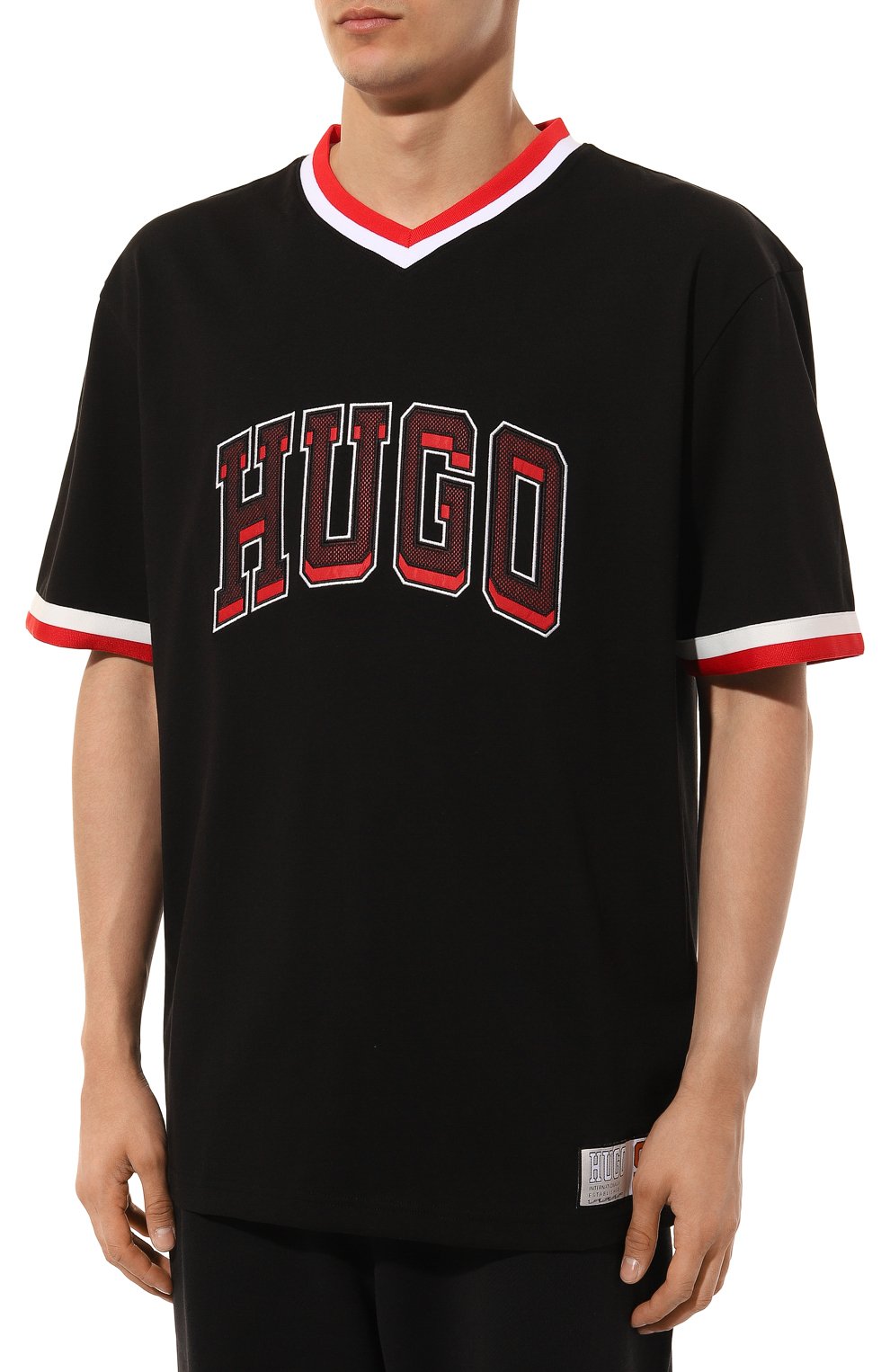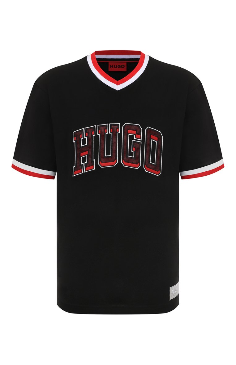 Дизайн черной футболки с кокеткой на спинке вдохновлен униформой студенческих спортивных команд Лиги плюща. Клубную символику заменяет крупный логотип марки, основанной Хуго Фердинандом Боссом, а манжеты коротких рукавов и V-образную горловину расчерчивает бело-красная полоска. Модель с фирменным патчем возле левого бокового шва выполнили из плотного джерси, экологичный хлопок для которого произвели в рамках программы Cotton made in Africa на небольших африканских фермах.