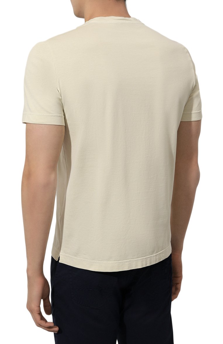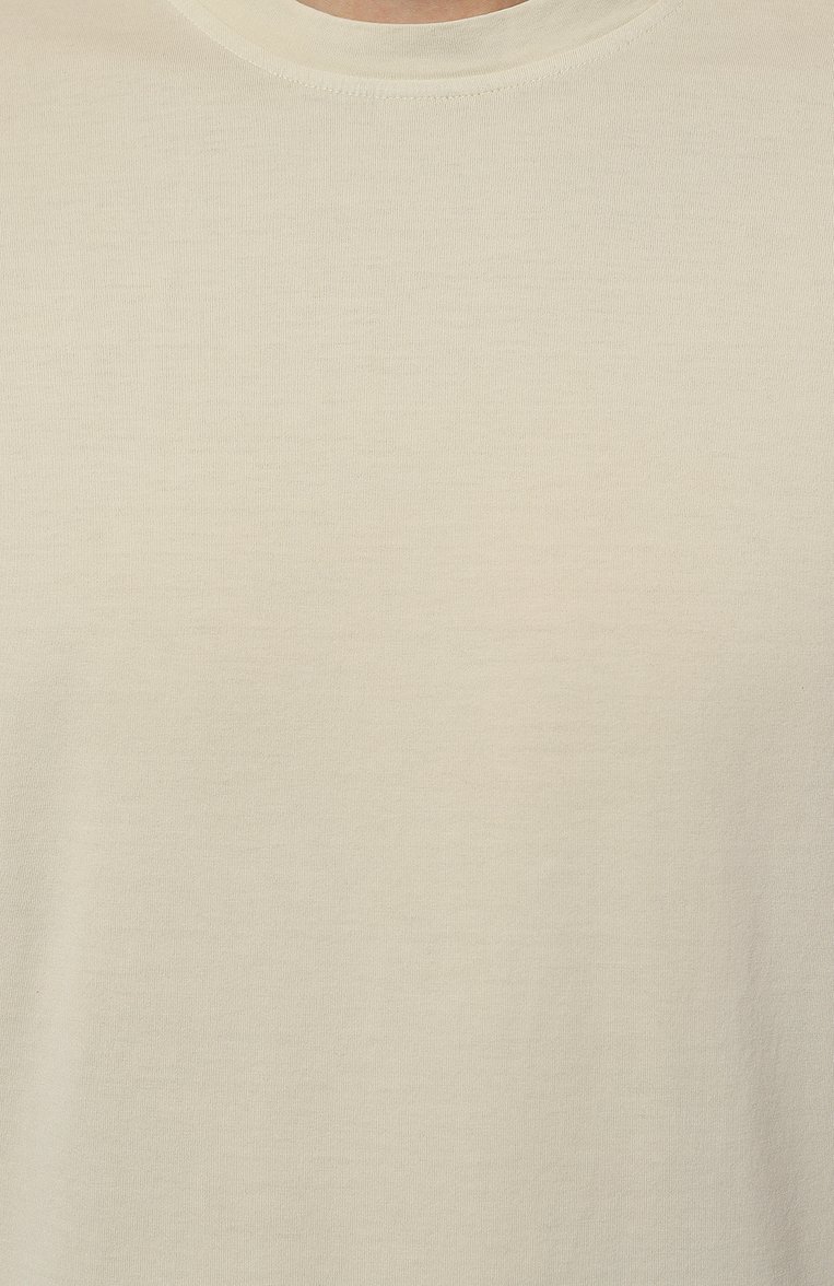 Кремовую футболку без принтов легко сочетать и с яркими вещами, и с одеждой в базовой гамме. Для пошива модели использовали мягкое дышащее джерси из хлопка supima с особенно длинными тонкими волокнами, в гладкости и прочности не уступающими шелку. Изделие из такого материала приятно ощущается на теле и не теряет безупречный вид даже после множества стирок. Вещь окрасили в готовом виде экологичными пигментами, поэтому она приобрела слегка неравномерный оттенок.